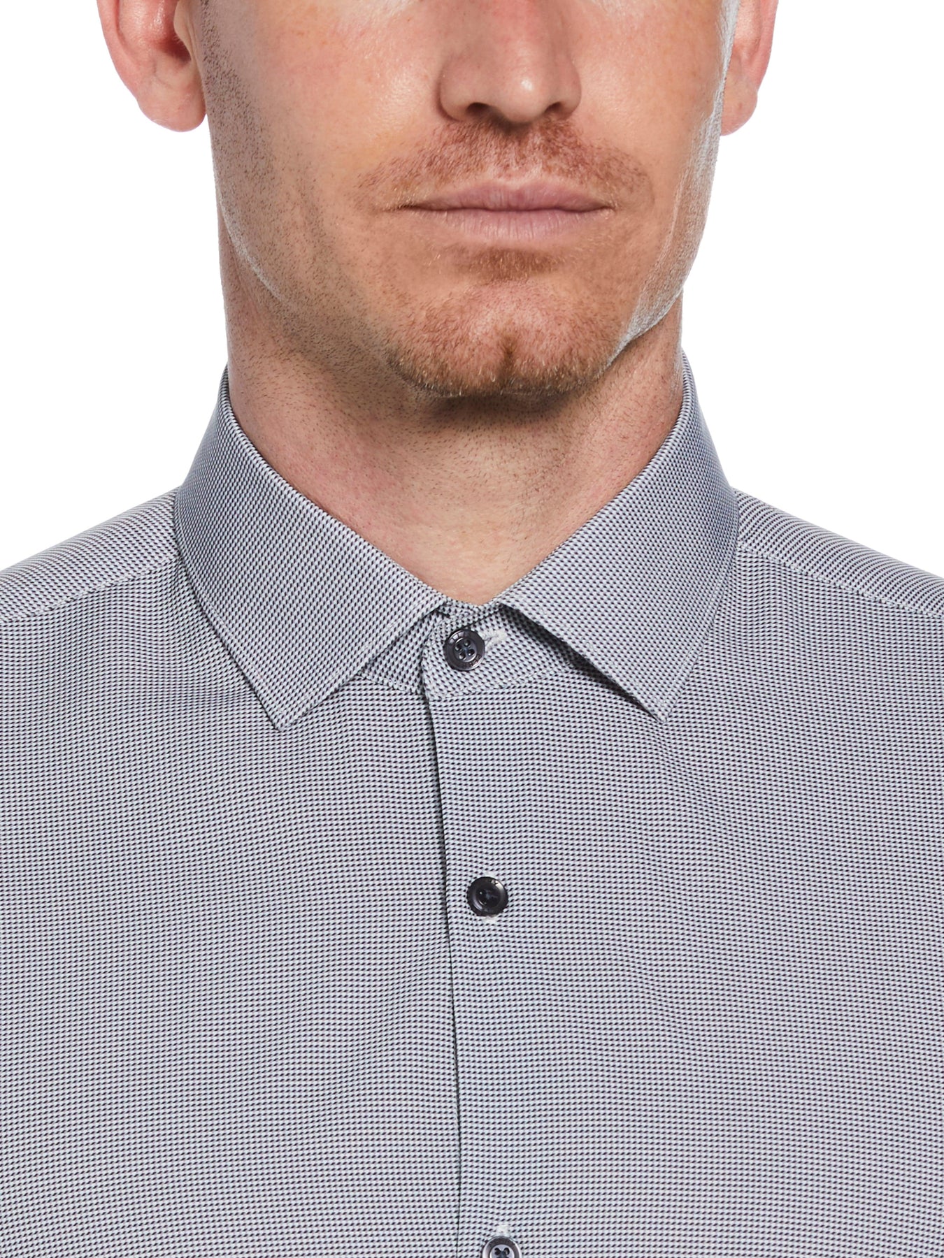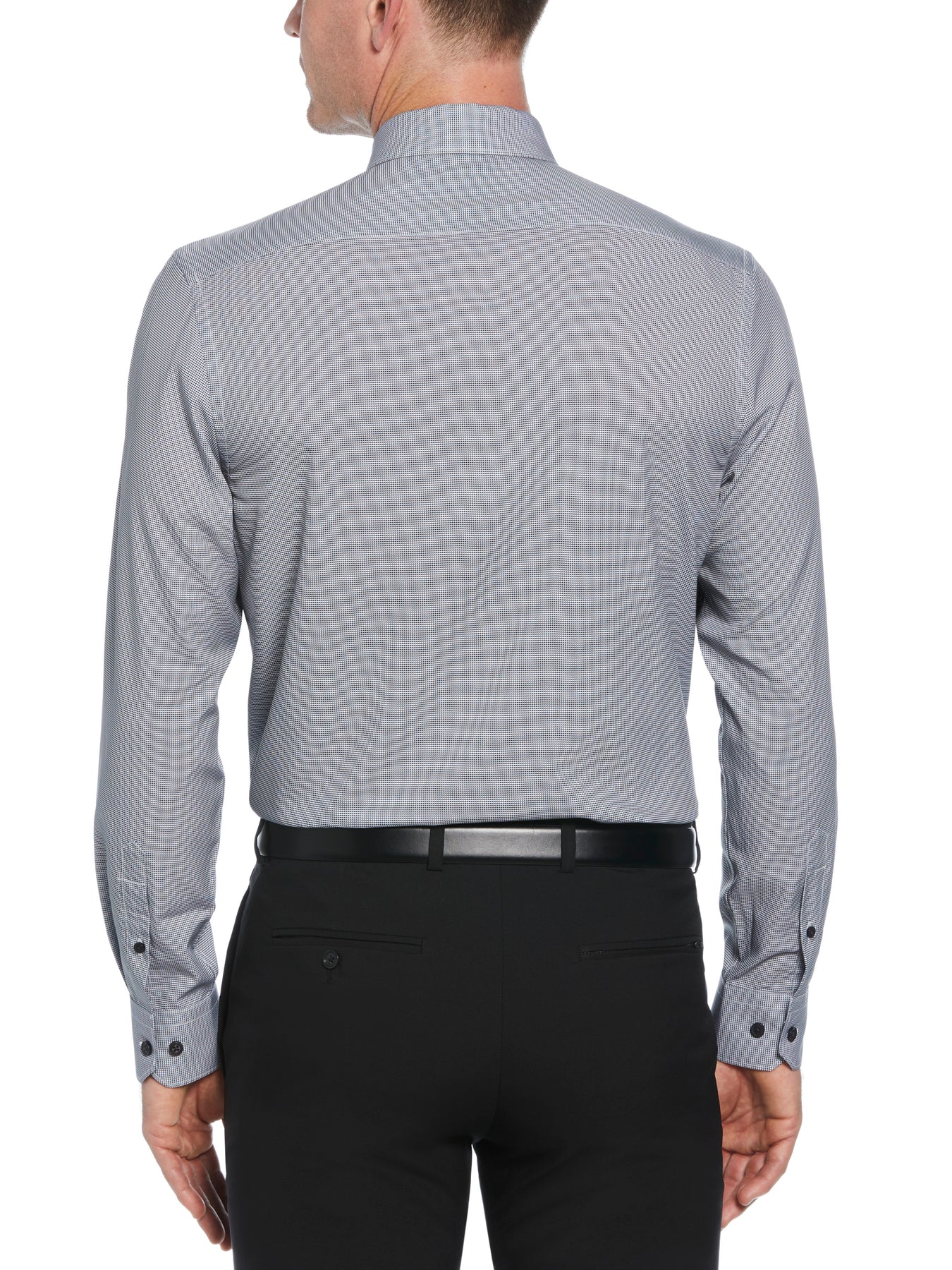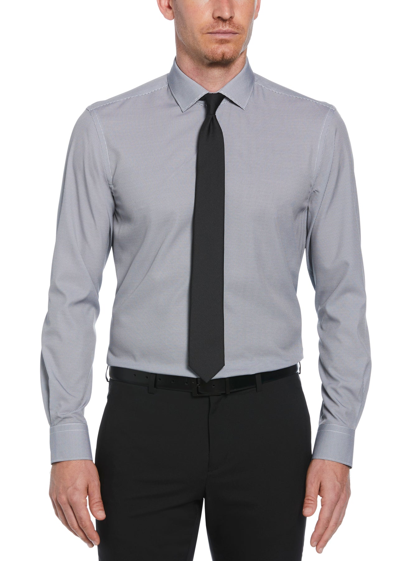 Give your professional wear an eye-catching finish with this Perry Ellis men's button-down shirt. The houndstooth print adds a unique touch that elevates your look. This long sleeve shirt also has a slim fit for a flattering silhouette and a spread collar, so you can dress it up for a wedding, business presentation or semi-casual events. Finished with stretch, this men's long sleeve shirt is made for comfort as much as style.