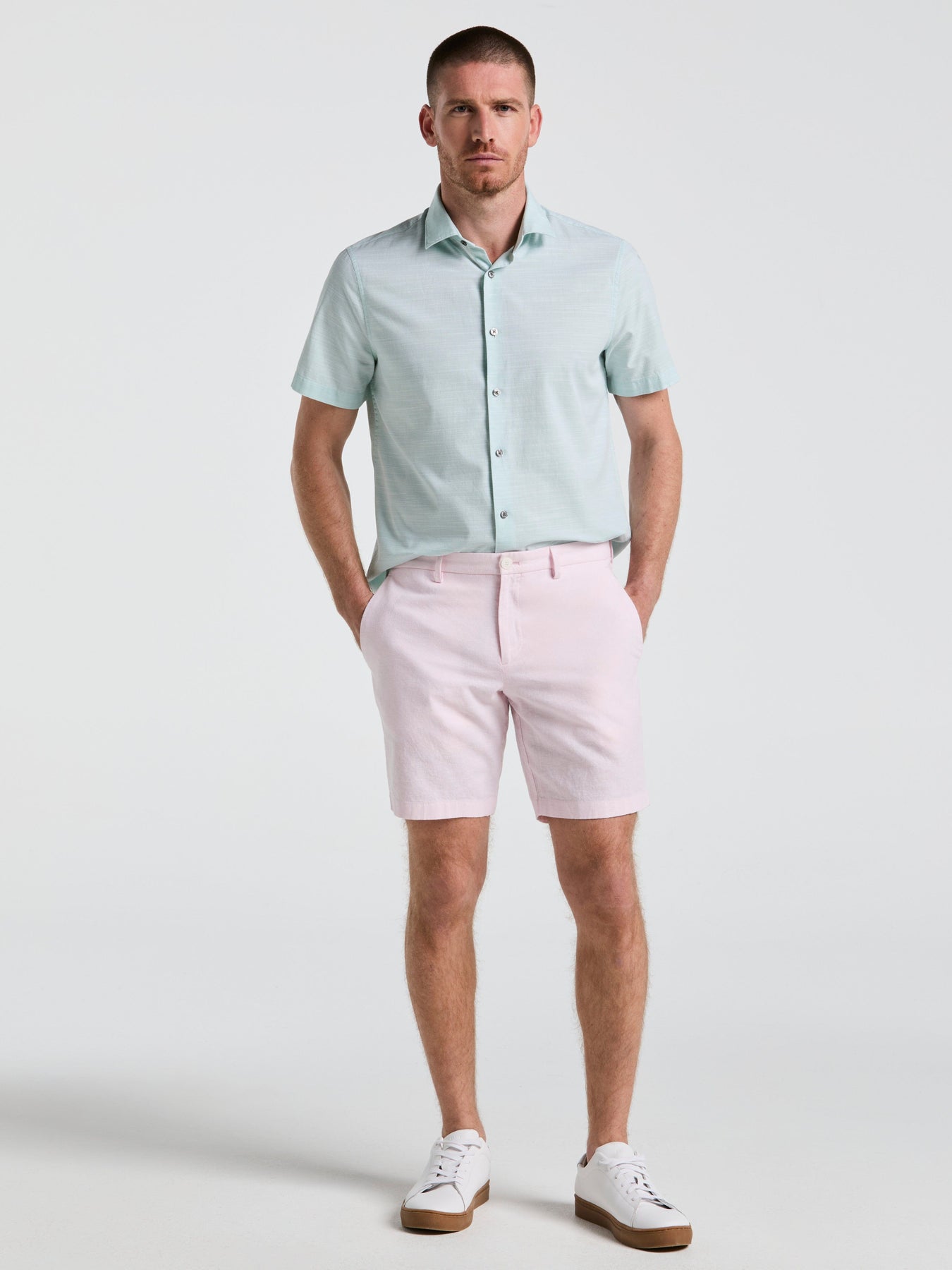 Elevate your warm weather style with these men's shorts from Perry Ellis. Featuring a flat front design, these men's shorts offer a seamless look that takes your casual style up a notch. Made for easy wear, the linen-blend men's shorts have a solid color design to style with a range of tops.