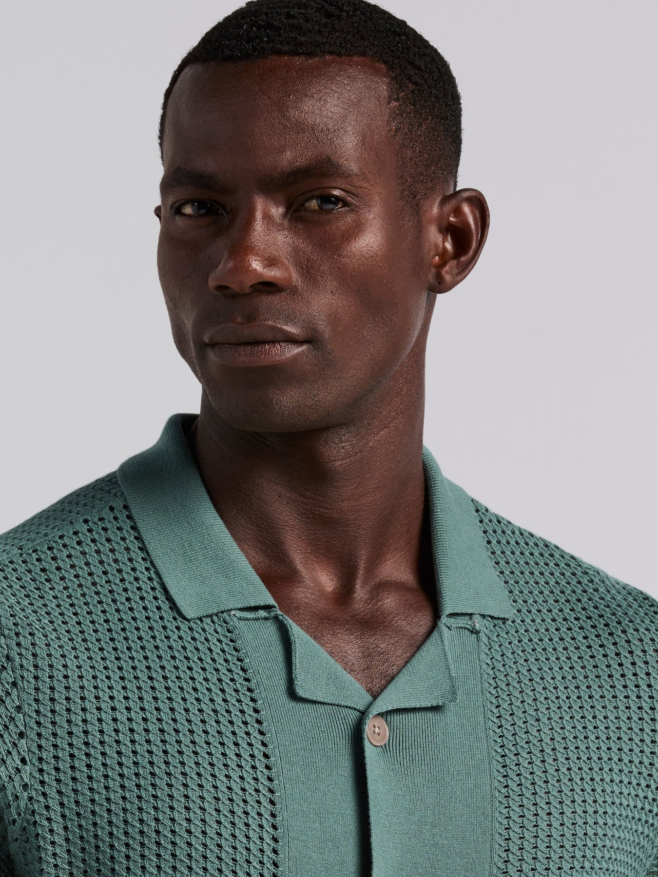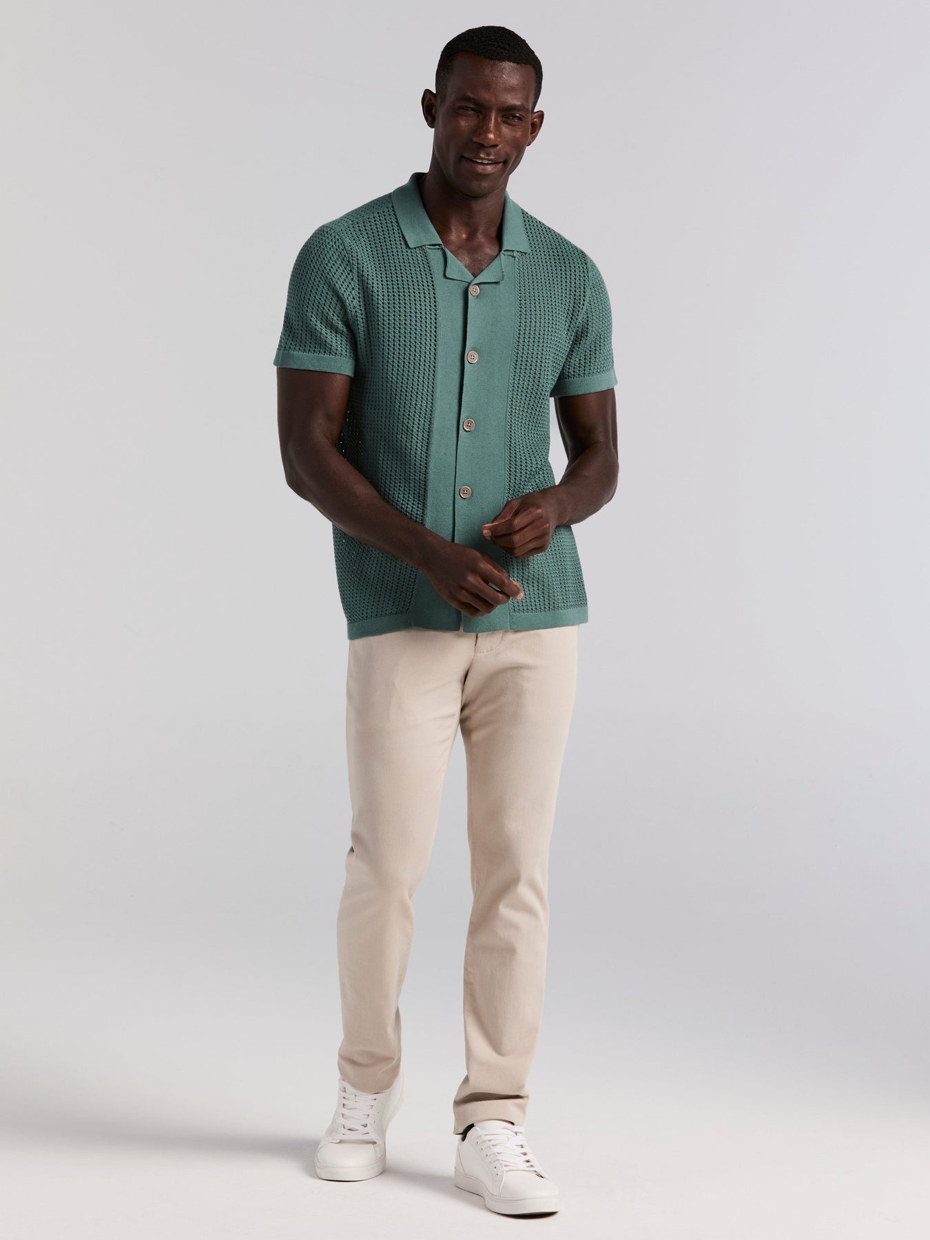 Elevate your casual wardrobe with the Perry Ellis Men's Cotton Jacquard Open Stitch Button Front Sweater. Crafted from a breathable and soft cotton fabric, this versatile men's sweater features an intricate jacquard open stitch design that adds sophisticated texture. The stylish button front closure and modern button-down collar provide a polished look. Designed with short sleeves, this men's knit sweater is perfect for comfortable, warm-weather wear. Pair this effortless short sleeve sweater with your favorite shorts or tailored trousers for a fresh and confident ensemble, making it an essential addition to any man's collection.
