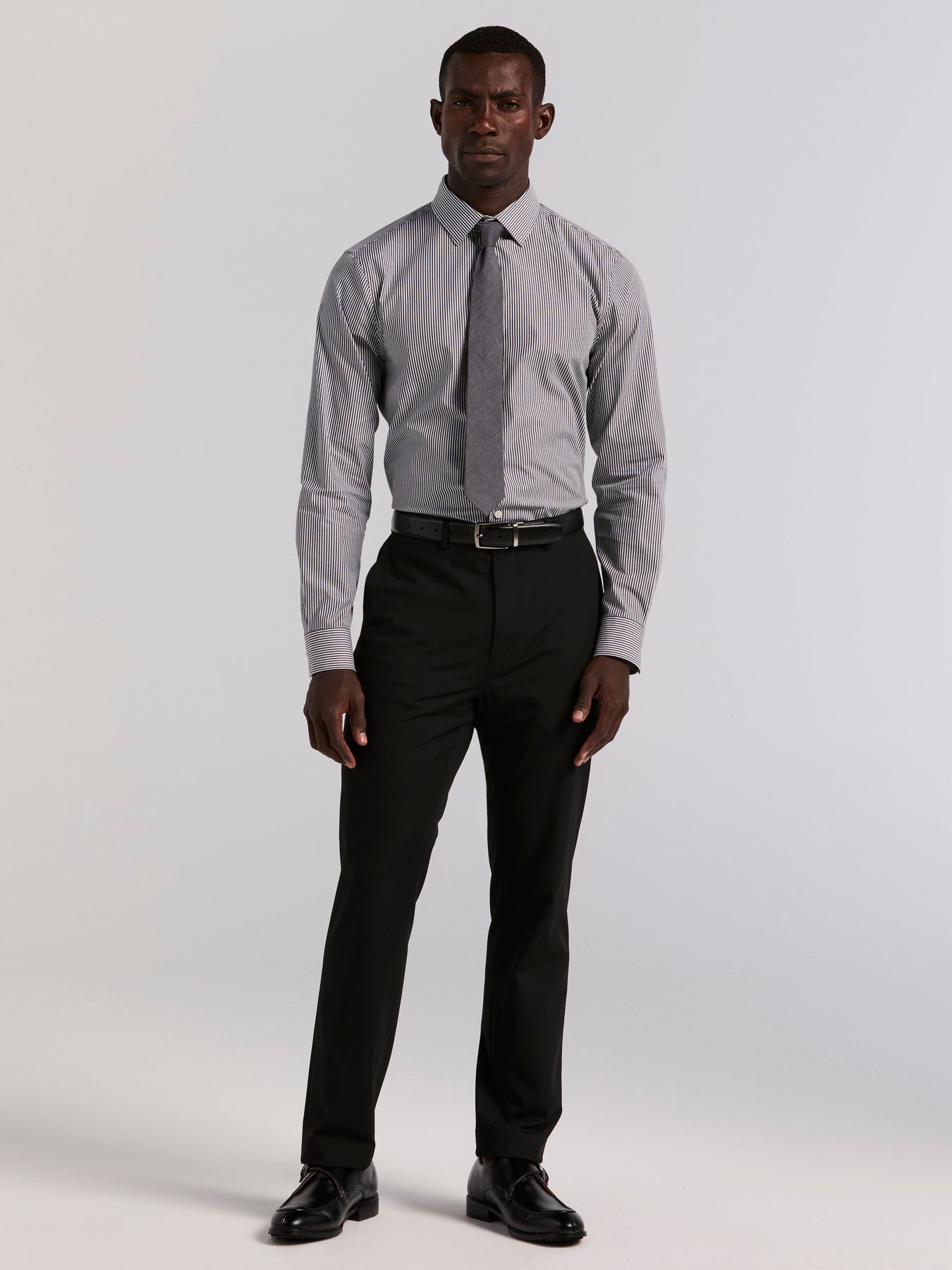 This Perry Ellis men's dress shirt delivers stylish versatility. Featuring a bengal stripe print and a classic spread collar, this slim-fit shirt adds subtle visual interest to both professional and social looks. Crafted from stretch poplin fabrication, this long sleeve shirt moves with you for comfortable, all-day wear.