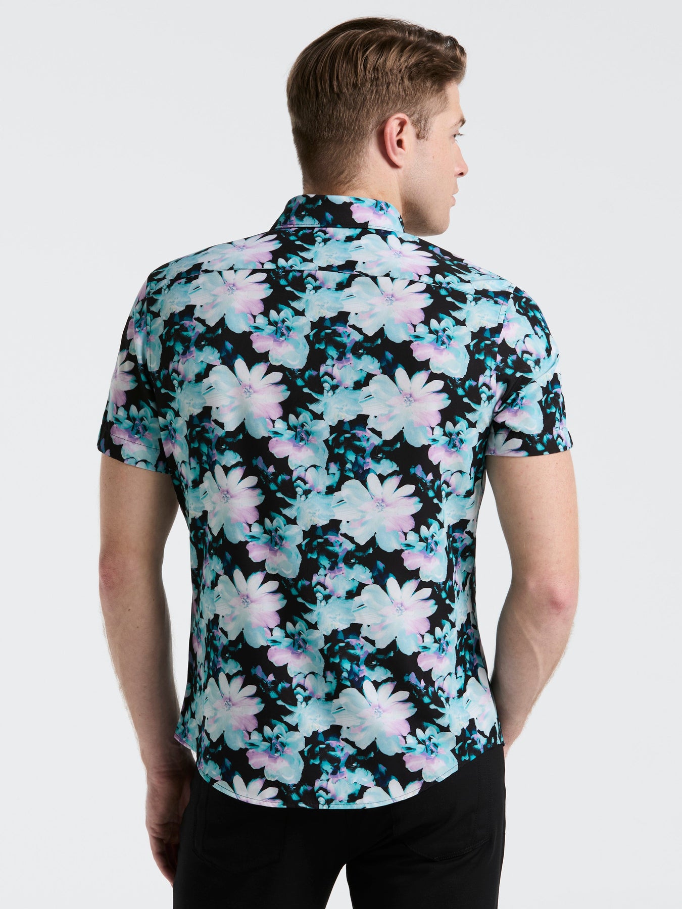 Highlight your unique style with this Perry Ellis men's short sleeve button up shirt. The slim fit and floral pattern give this men's short sleeve shirt a modern update to elevate your casual wear. Plus, moisture-wicking technology helps you feel dry and comfortable throughout the day.