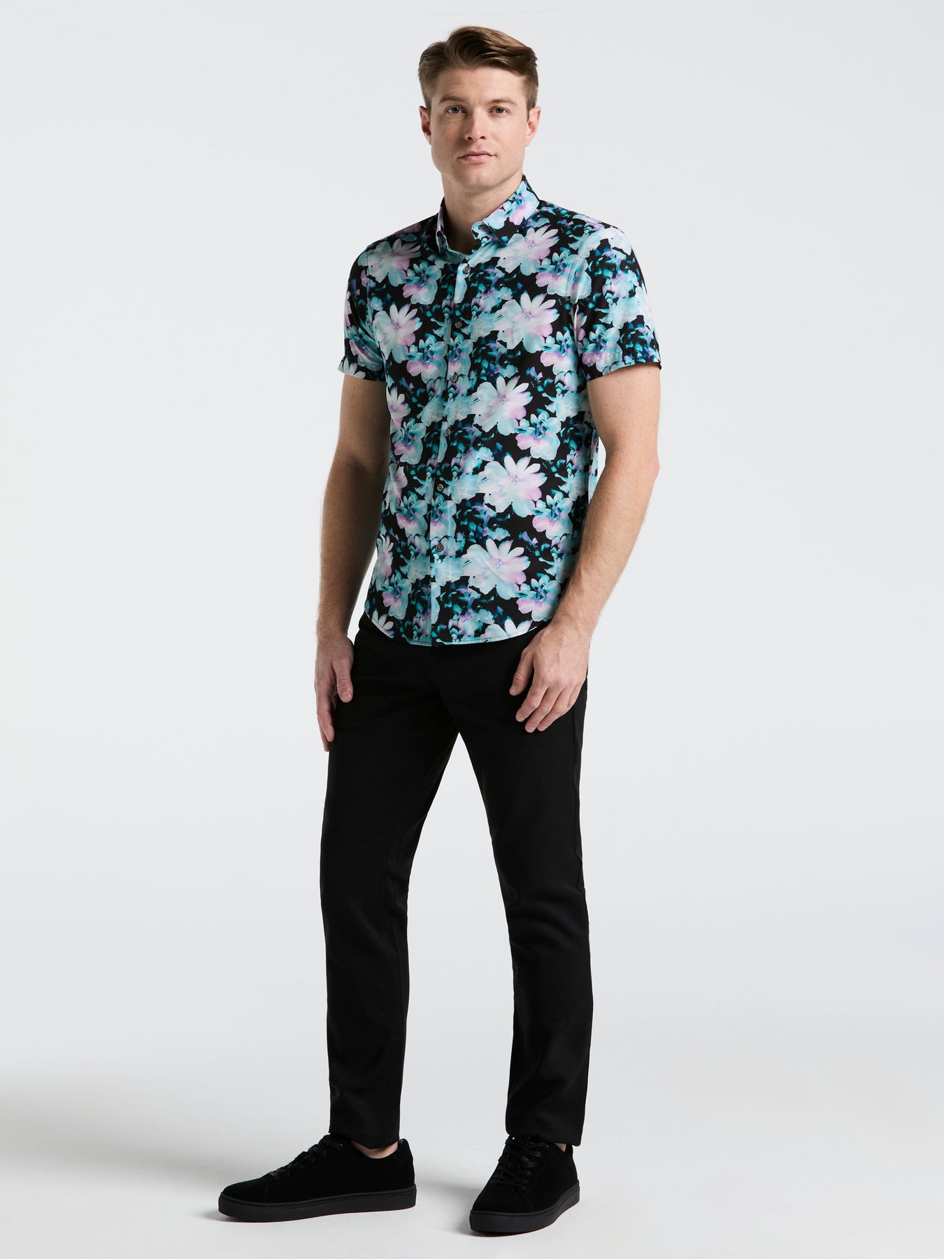 Highlight your unique style with this Perry Ellis men's short sleeve button up shirt. The slim fit and floral pattern give this men's short sleeve shirt a modern update to elevate your casual wear. Plus, moisture-wicking technology helps you feel dry and comfortable throughout the day.