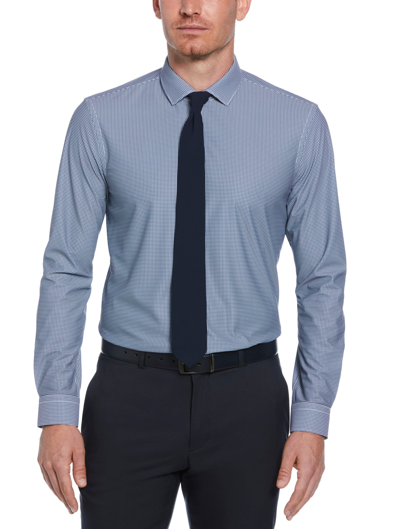 Keep your look refined with this Perry Ellis men's button-down shirt. Featuring a black and white checkered print, this men's long sleeve shirt has a timeless look while the slim fit makes for a neat silhouette. It's finished with a spread collar for a polished and sophisticated finishing touch.