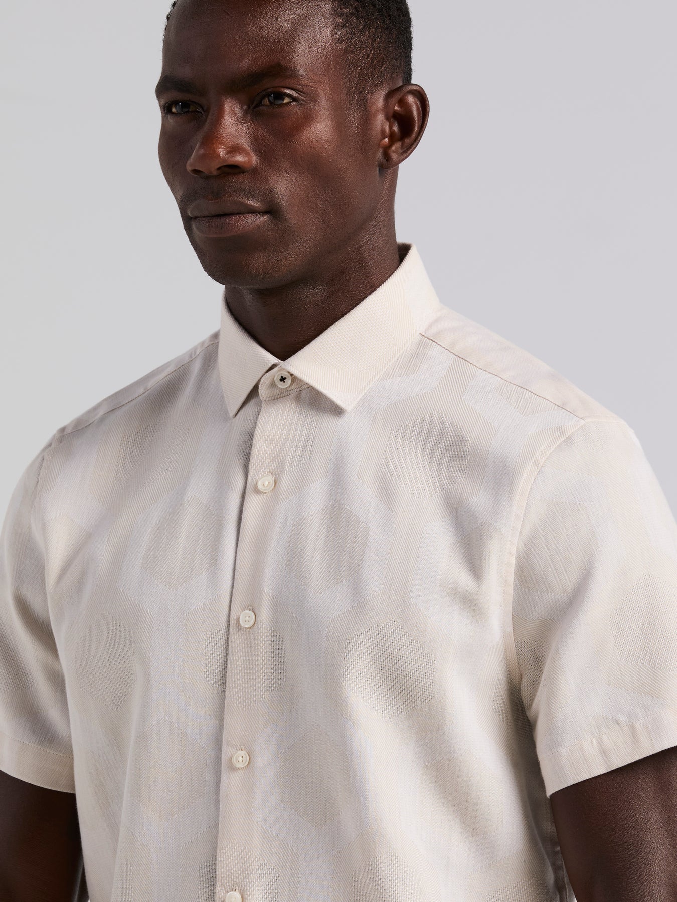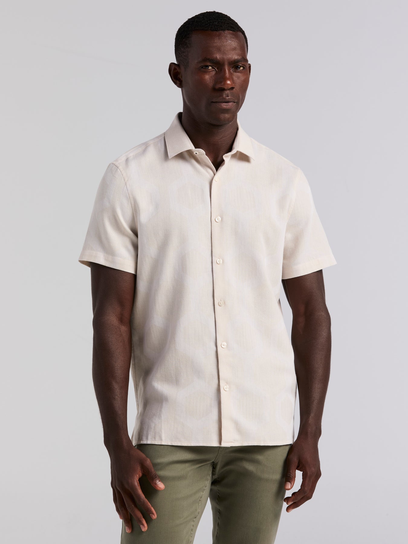 Elevate your casual wardrobe with the Perry Ellis Cotton Linen Geo Jacquard Short Sleeve Shirt. Crafted from a breathable cotton and linen blend fabric, this men's shirt ensures cool comfort on warmer days. The distinctive jacquard fabrication showcases a large geometric pattern, adding subtle texture and visual interest to your look. Featuring a timeless spread collar and short sleeves, this versatile cotton linen shirt is perfect for effortlessly styling for any relaxed occasion, offering a confident and fresh feel.
