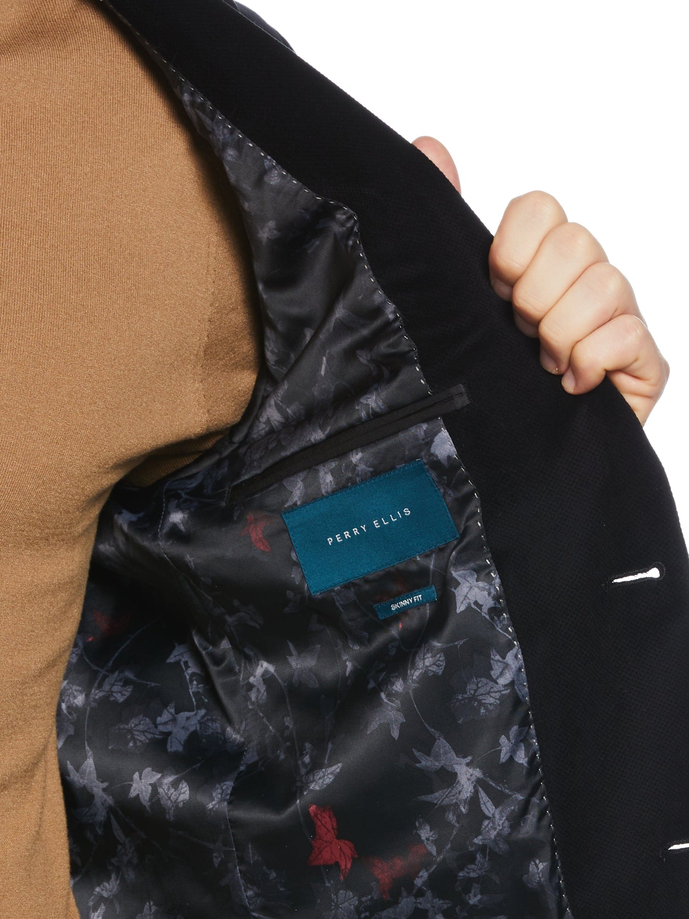 Crafted from plush velvet, this Perry Ellis men's sportcoat delivers a luxurious and modern look for special events, holiday parties and more. This blazer features a sleek skinny fit and is versatile enough to pair with dress pants or jeans.