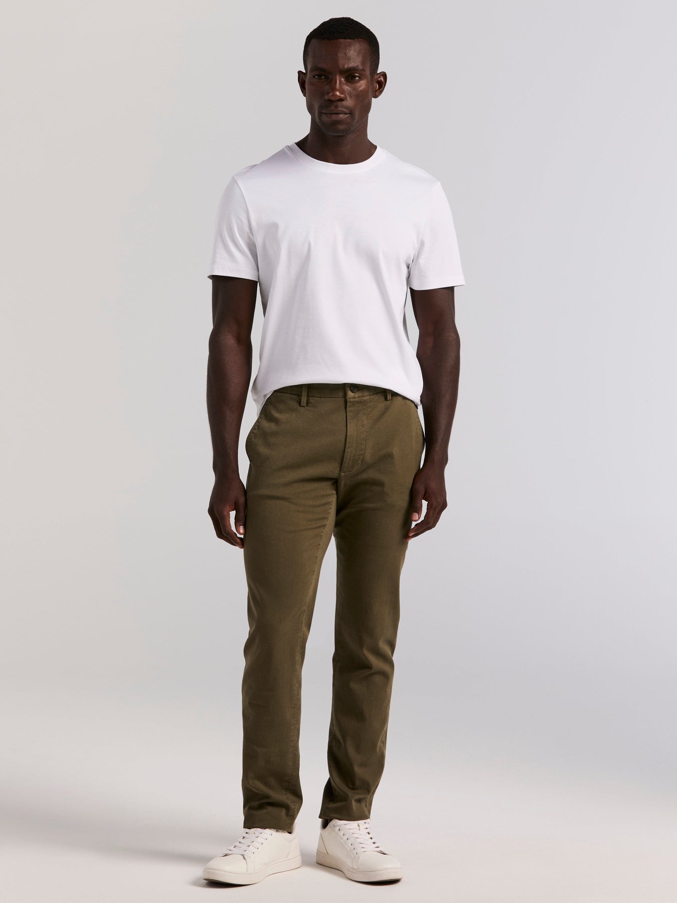 These men's pants give your smart-casual wear a neat and stylish touch. The slim fit silhouette and flat front design adds a sleek finish whether you're wearing these chino trousers with a button-down or polo while the solid color makes it easy to style with a range of other tones. These casual men's pants include stretch for easy, comfortable movement throughout the day.