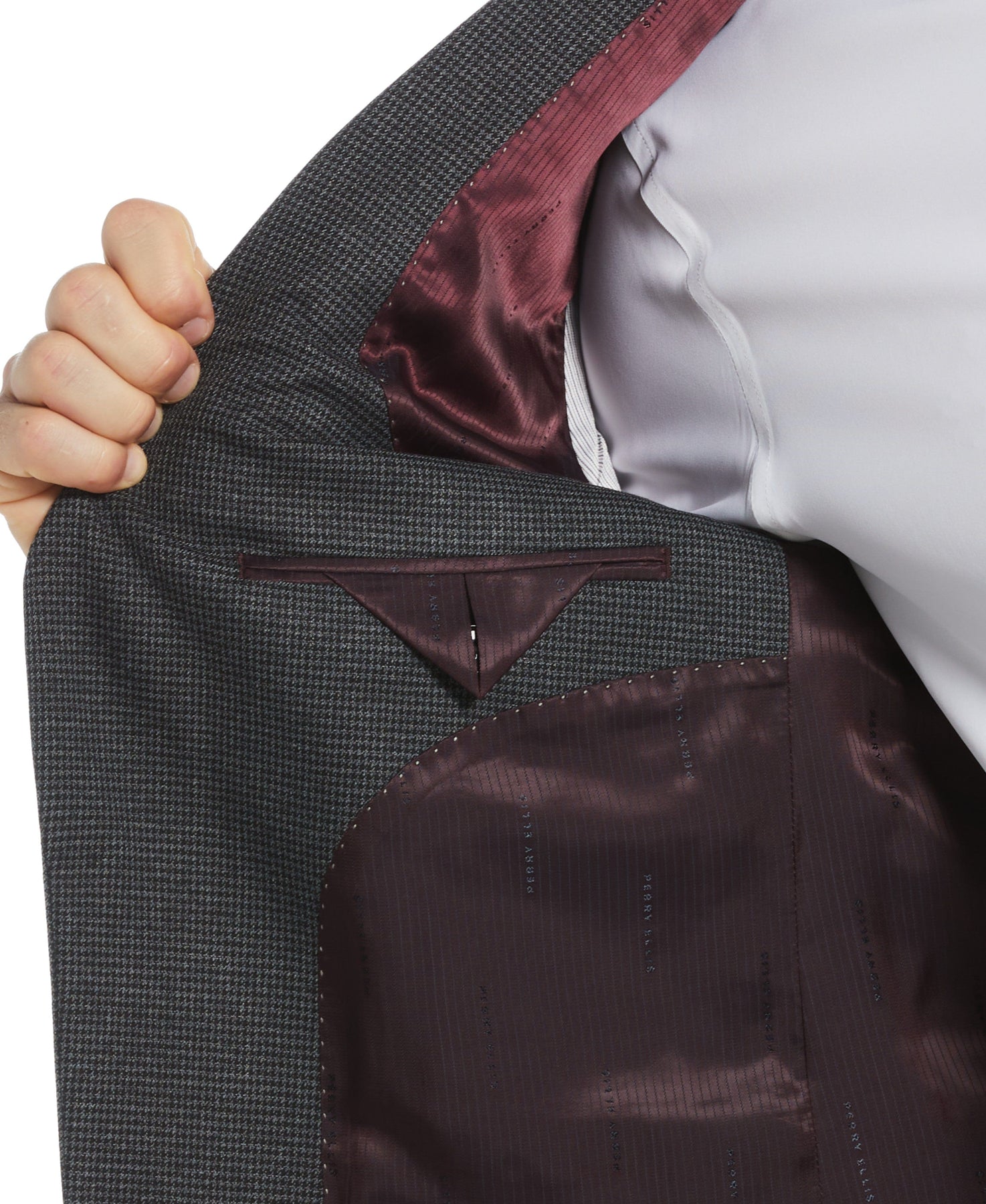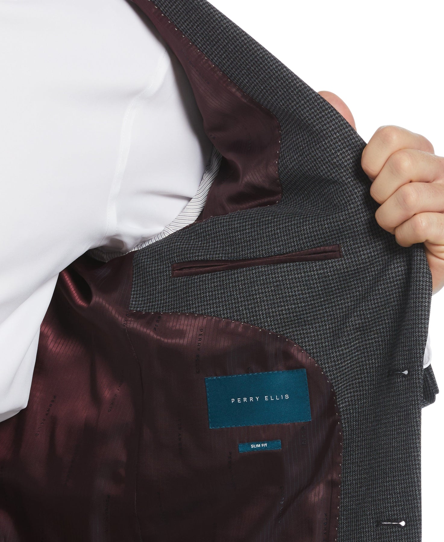 Step up your style with this Perry Ellis men's suit jacket, featuring a classic houndstooth print. The single-breasted, two-button sport coat is designed with a slim fit and crafted with stretch fabric for comfort. Look sharp at the office or out on the town in this sport jacket.