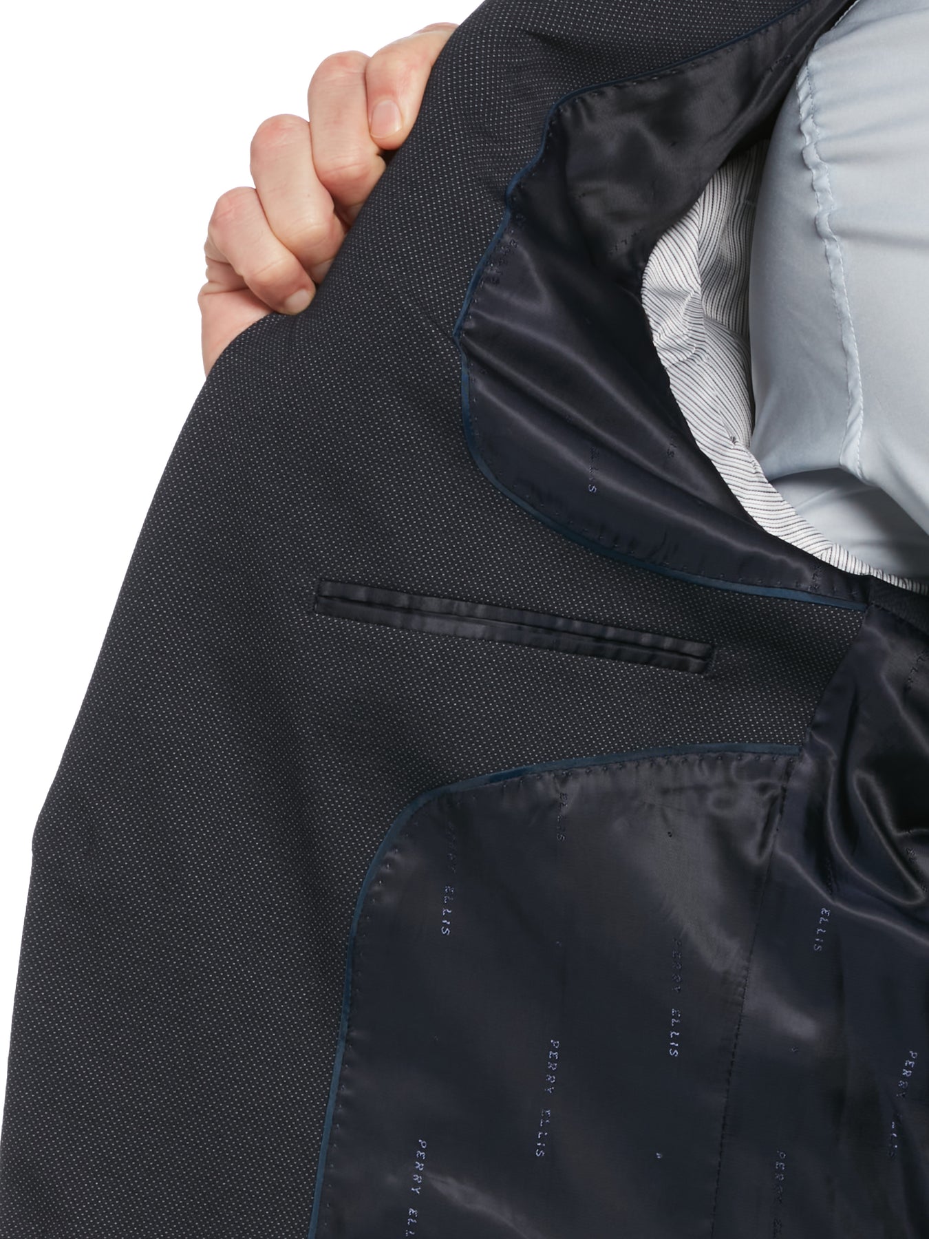 Elevate any outfit by adding this slim-fit suit jacket from Perry Ellis. With its sleek silhouette, versatile pin dot print and textured four-way stretch fabric, this sport coat will quickly become a go-to layering piece. A left chest pocket and front flap pockets offer convenient storage space for small essentials.
