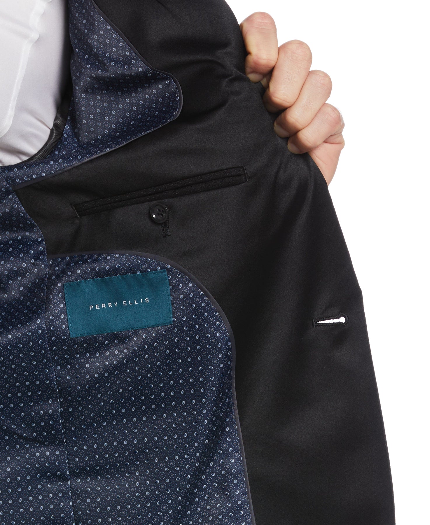 Contrast-colored lapels add a bold accent to this Perry Ellis tuxedo jacket, for a suave look that will stand out from the pack. The men’s dinner jacket is crafted from a textured fabric that contrasts beautifully with smooth, crisp button-down shirts. A chest pocket and two flap-closed pockets at the front provide space to accessorize or store small essentials.