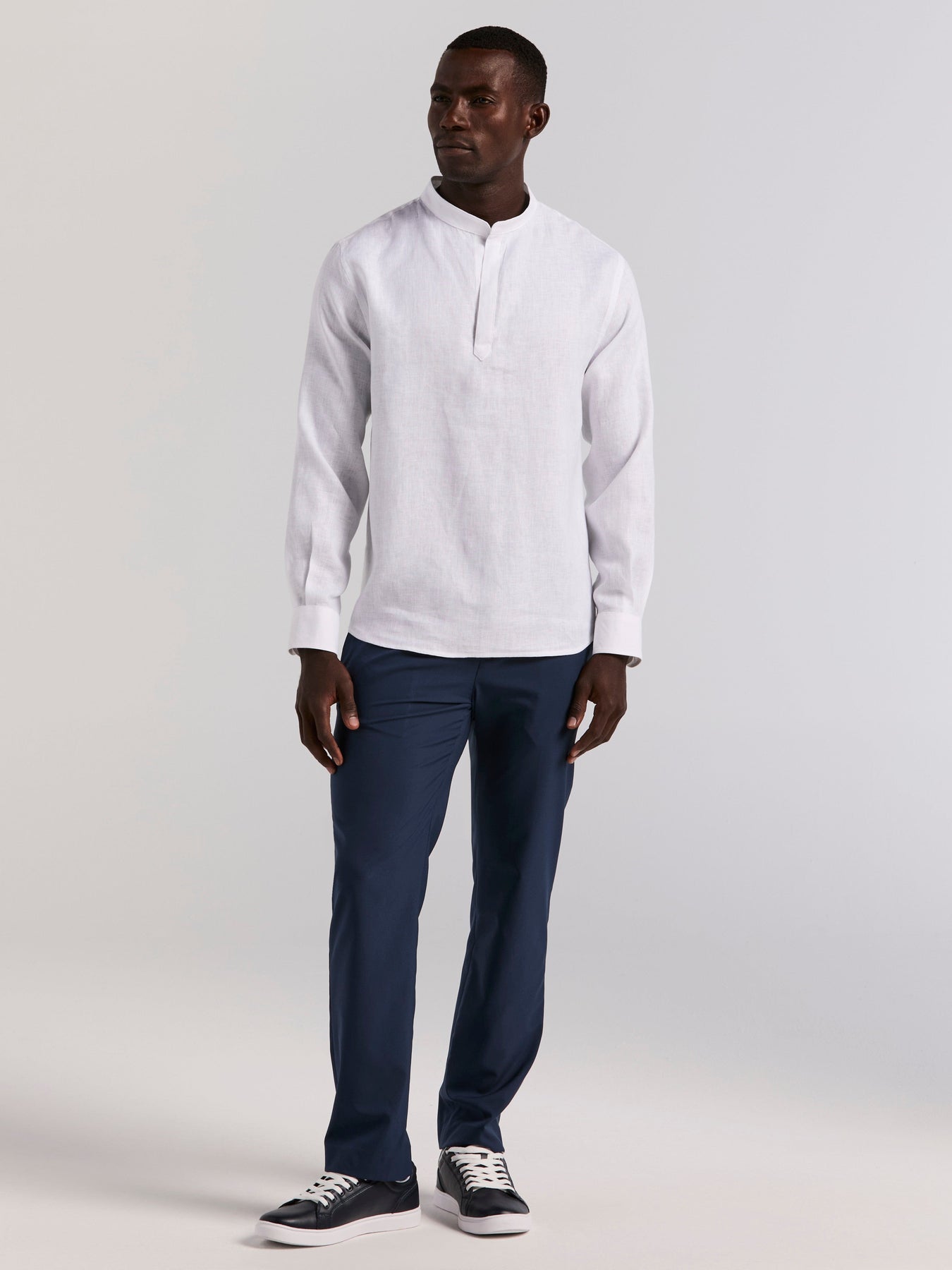 Add effortless polish to your look with this Perry Ellis long sleeve shirt made with 100% linen fabric. Plain weave fabrication delivers lasting durability, while the breathable linen ensures comfortable cool wear. The stand collar and popover design offer a fresh modern twist on the classic button-down. This solid-colored men's linen shirt is sure to be your new wardrobe workhorse.