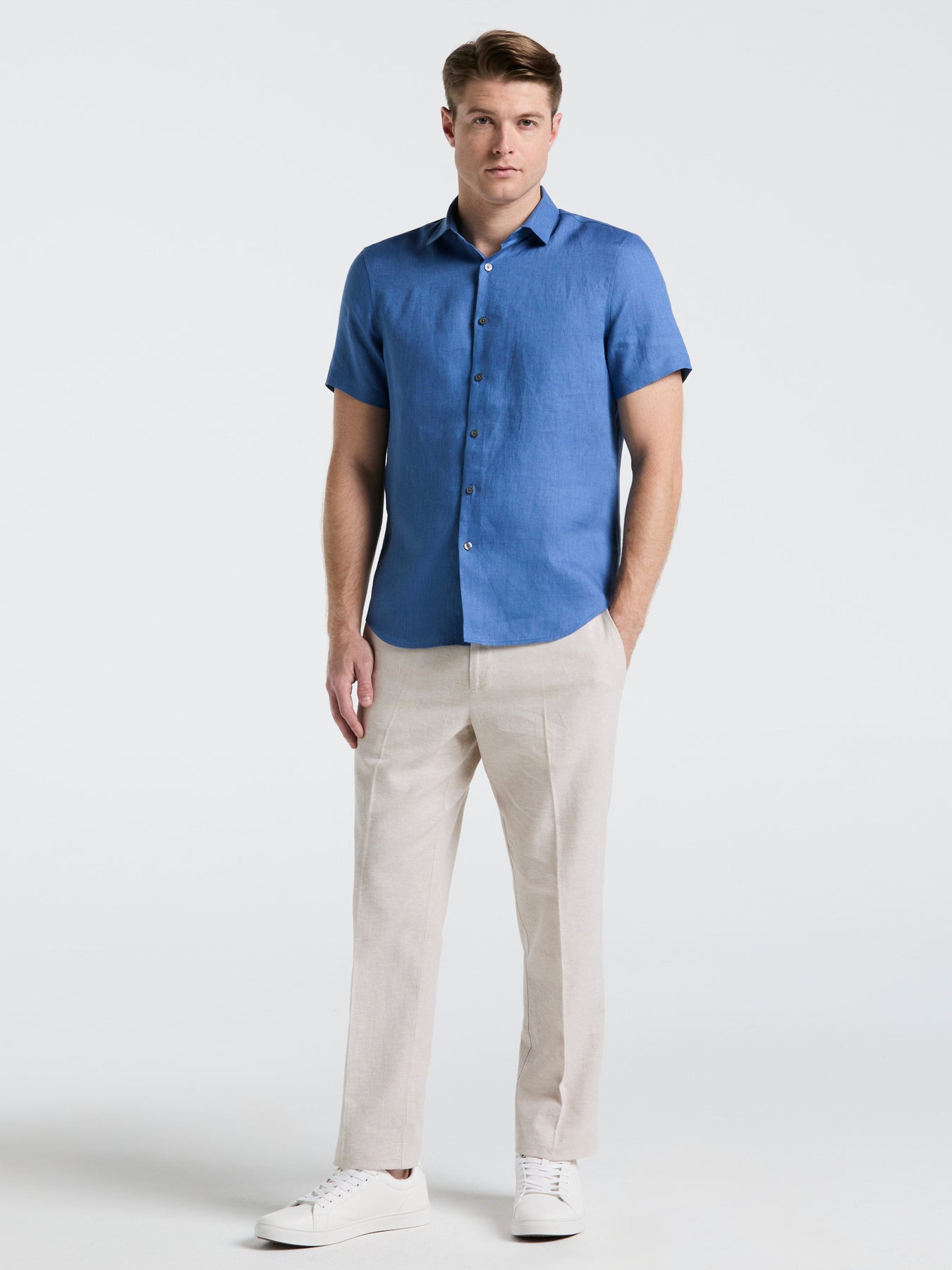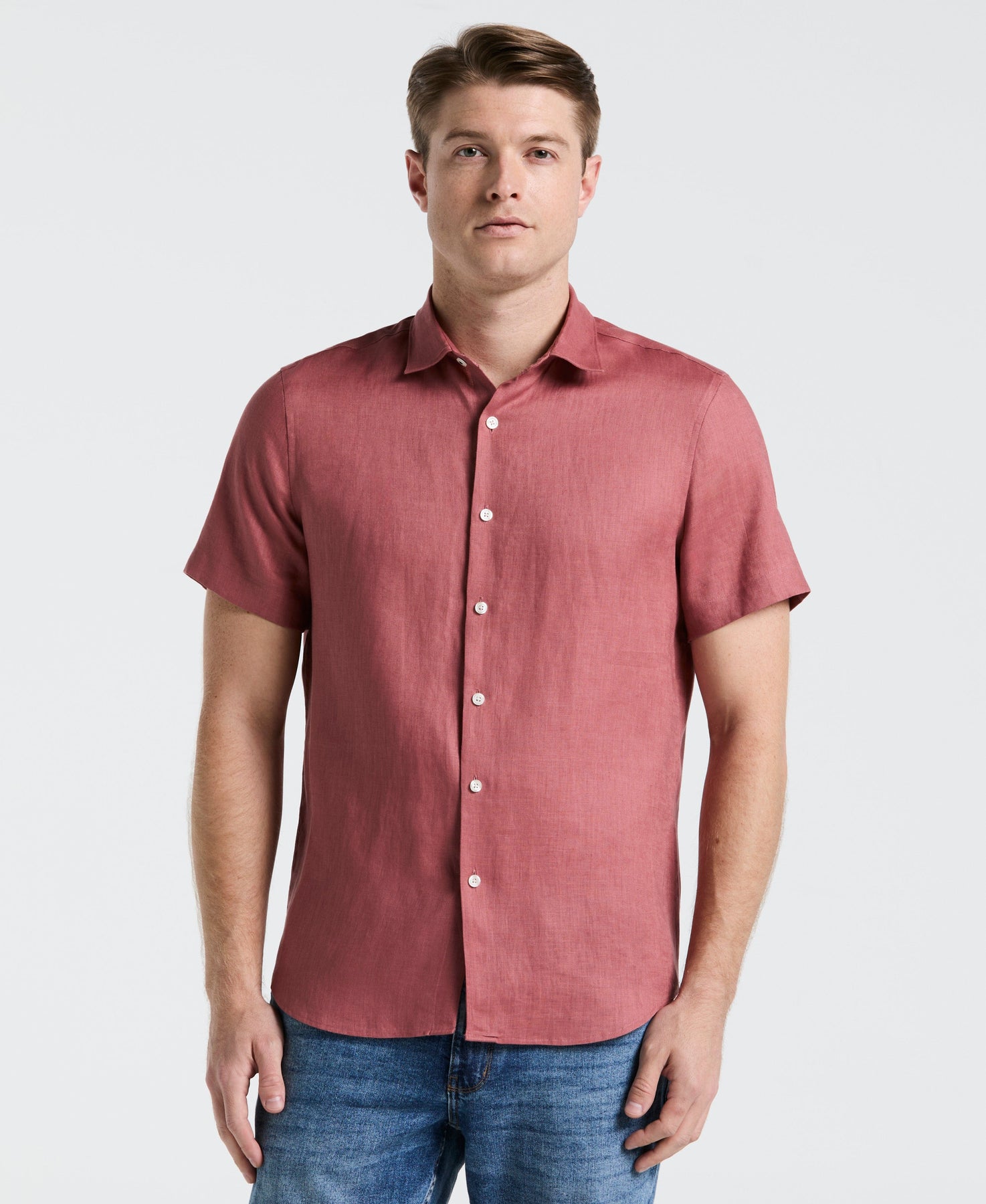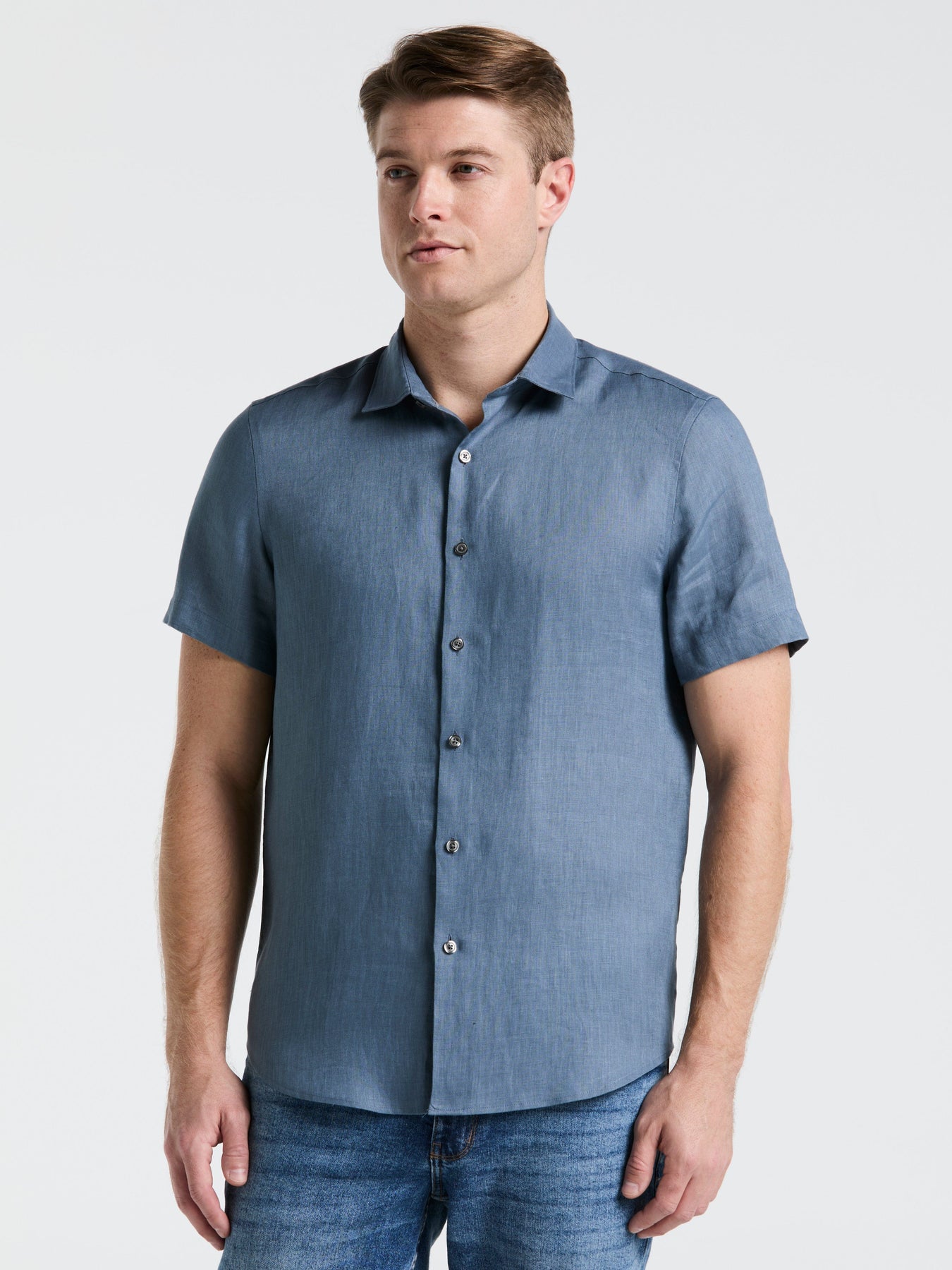 Comfortable and polished, this Perry Ellis men's linen short sleeve shirt is the ideal choice for warm weather day or evening events. The spread collar and button down design provides a smart touch to keep your look on point whether you're spending the day with family or out for the evening. This men's linen shirt comes in a solid color design for a sophisticated and subtle look that pairs seamlessly with a range of other colors for easy styling.