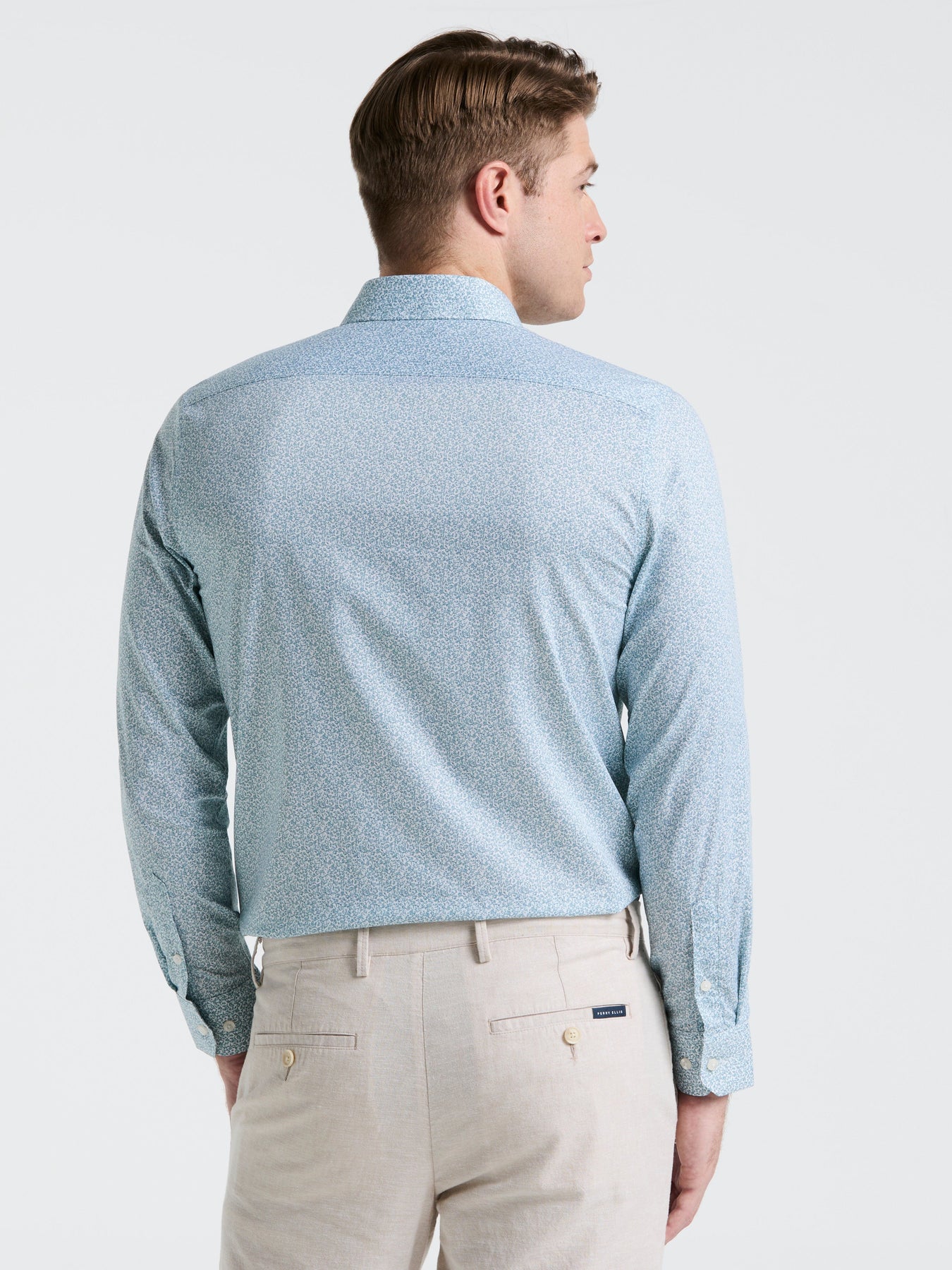 Give your smart-casual style a modern touch with this Perry Ellis men's button-down shirt that features a striking floral print. The slim fit keeps your silhouette sleek and streamlined while the spread collar offers a refined look. This long sleeve button-down shirt is made with stretch for enhanced comfort.