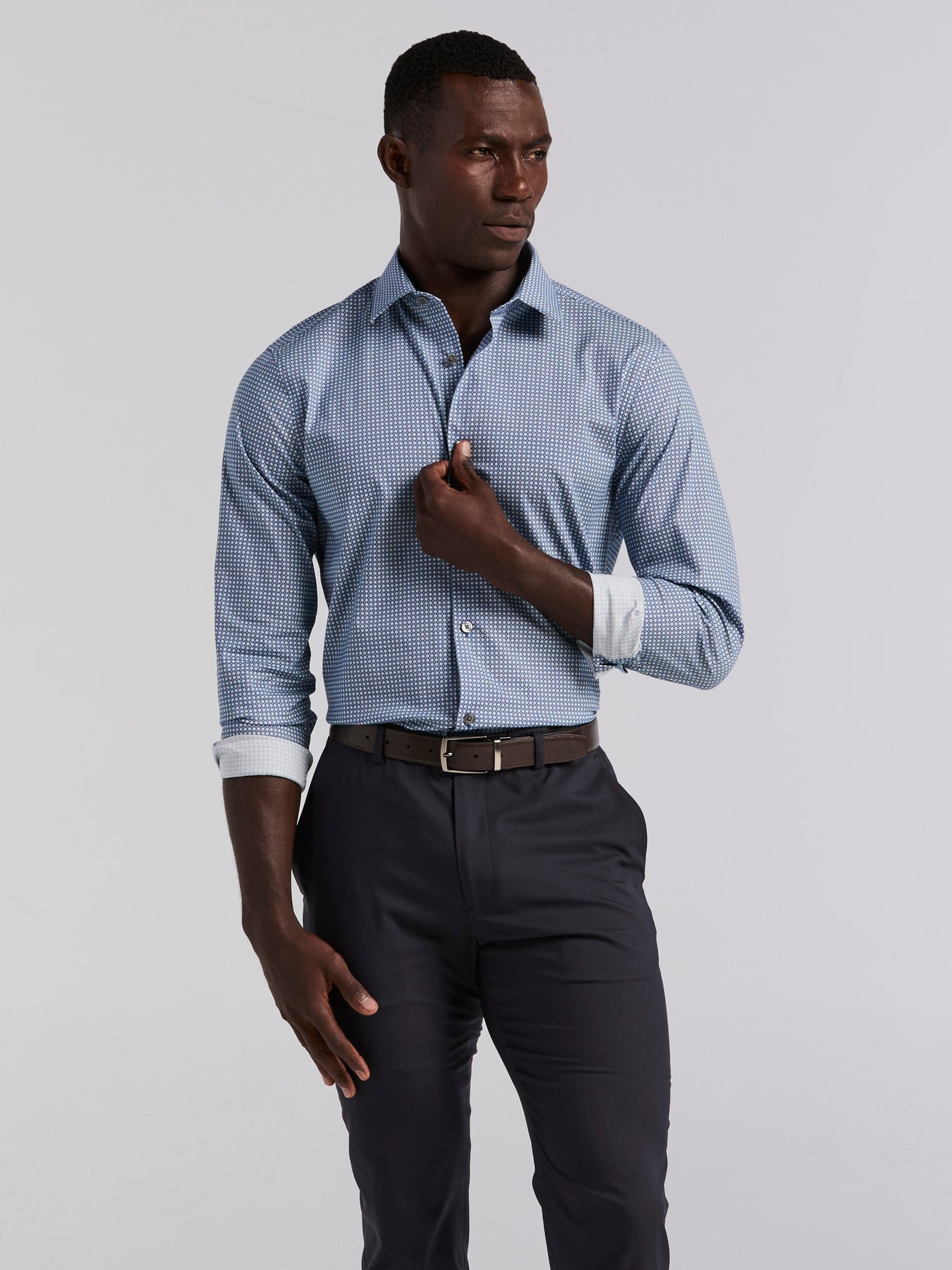 Update your 9-to-5 style with this contemporary men's dress shirt from Perry Ellis. This long-sleeve shirt features a tile geo print and a modern slim fit design. Made from lightweight poplin fabrication with stretch, this cotton shirt keeps you comfortable and flexible from morning meetings to after-work events. Pairs perfectly with a suit or chinos for effortless style.