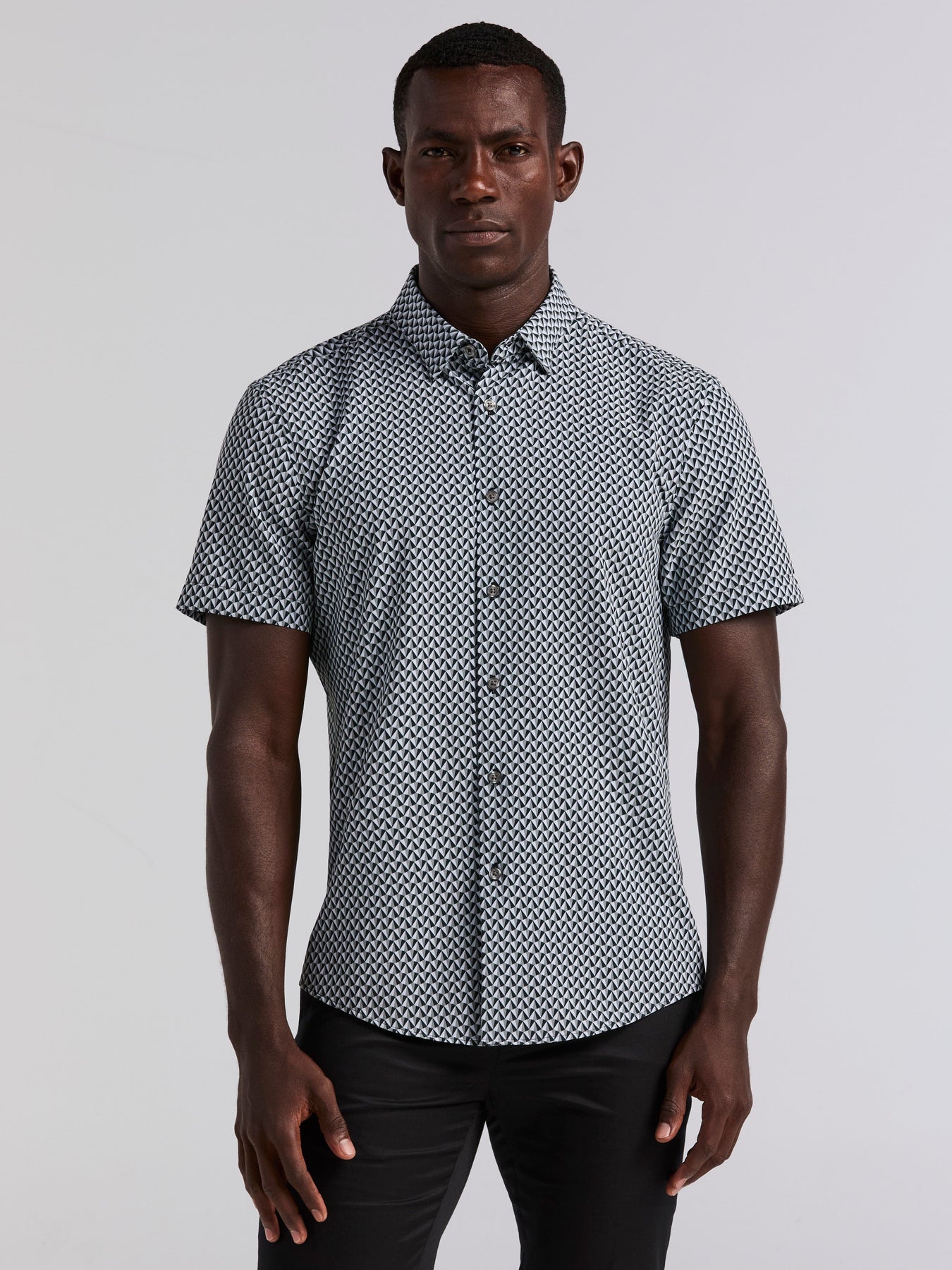 With an eye-catching triangle geo print, this short-sleeve shirt from Perry Ellis is sure to turn heads. Made with a slim fit that sits close to the body, this men's shirt is crafted with stretch to keep you comfortable and moving with ease. Moisture-wicking technology helps keep you cool and dry, while the expandable collar stretches for even more comfort.