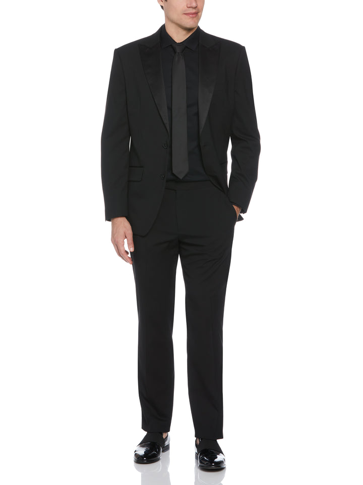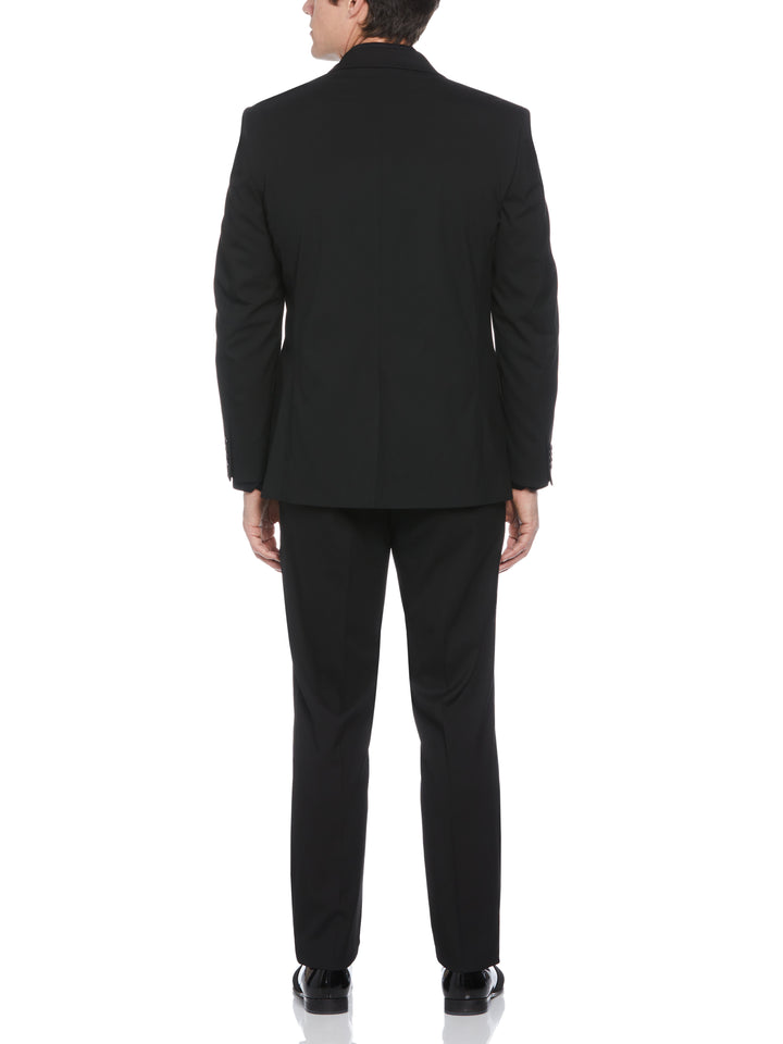 This Perry Ellis men's tuxedo jacket is an elegant wardrobe choice for formal occasions. Satin piecing on the narrow lapels and besom side pockets create a suave look that stands out. Enhanced with stretch, the durable plain weave fabric provides a comfortable fit for special black tie events.