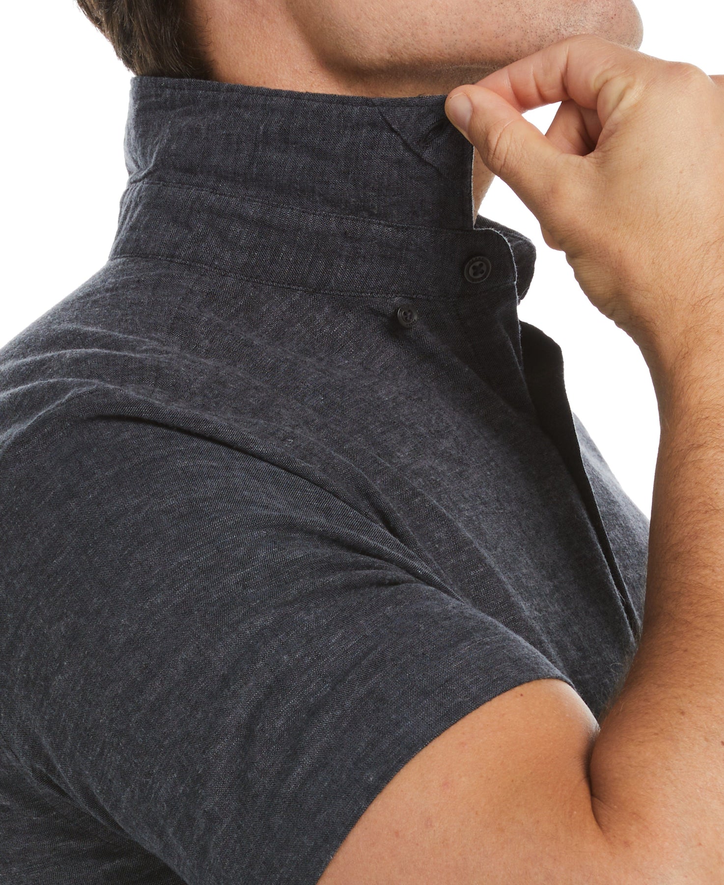 Get sleek modern style with this Perry Ellis men's black short sleeve button up shirt. The slim fit silhouette includes a shorter hem to wear untucked for a flattering and contemporary look. This men's short sleeve shirt is made from a durable, plain weave linen-blend fabric that includes stretch for enhanced comfort. The classic heathered finish complements a range of other colors and styles, making it a versatile addition to your wardrobe.