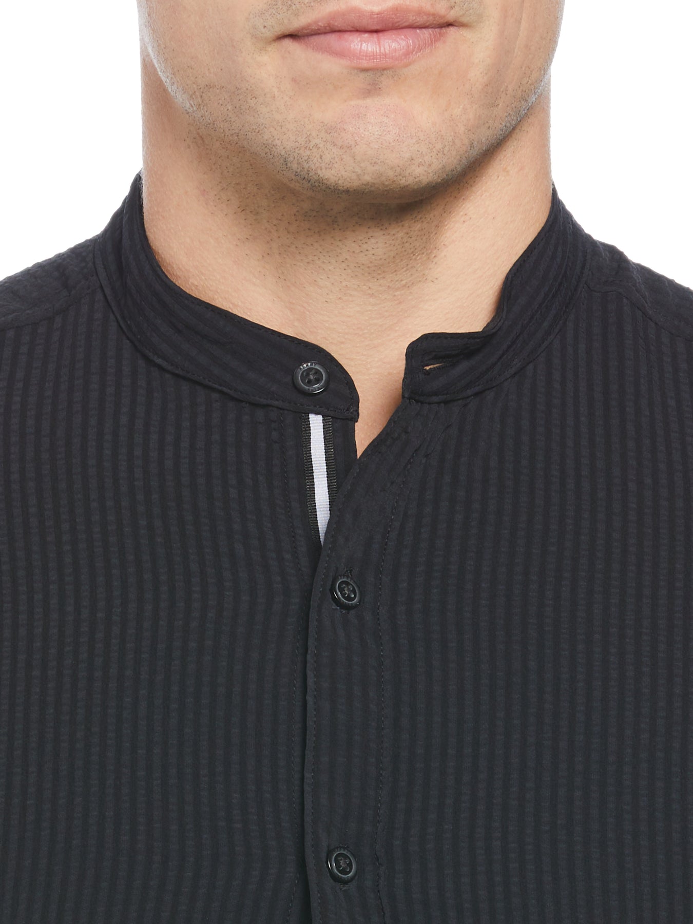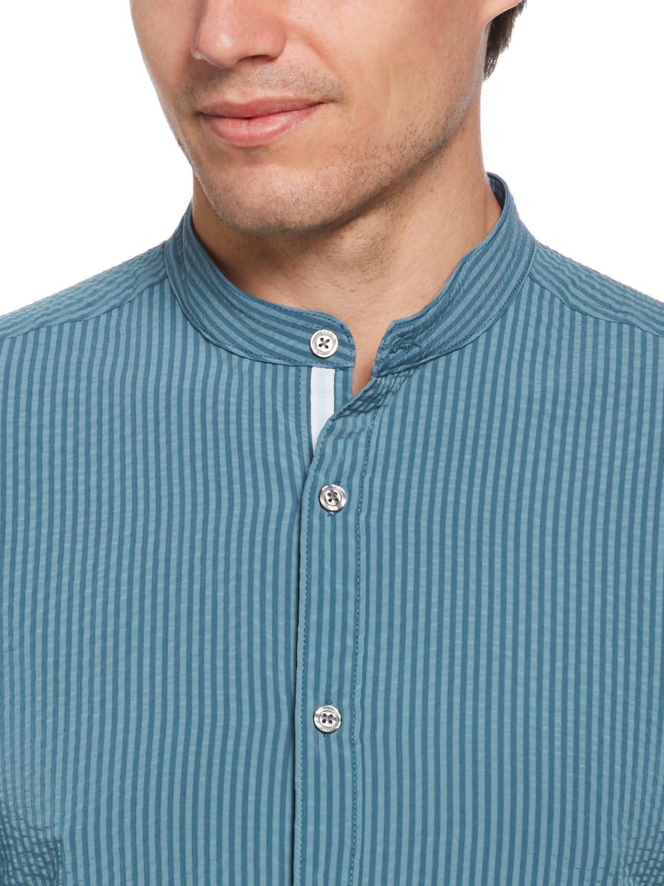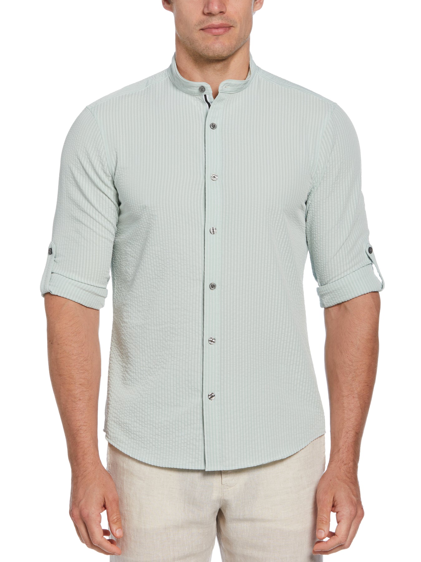 Seersucker fabric brings both eye-catching texture and a lightweight feel to this casual men’s orange long sleeve shirt from Perry Ellis. The men’s sport shirt is made with durable plain weave fabrication for long-lasting wear, and its shorter length makes it ideal for wearing untucked. A hint of stretch in the material helps to ensure a comfortable fit, while roll tabs on the sleeves let you pin them up for a more laidback look. A sleek banded collar adds a fresh, modern twist to the design.