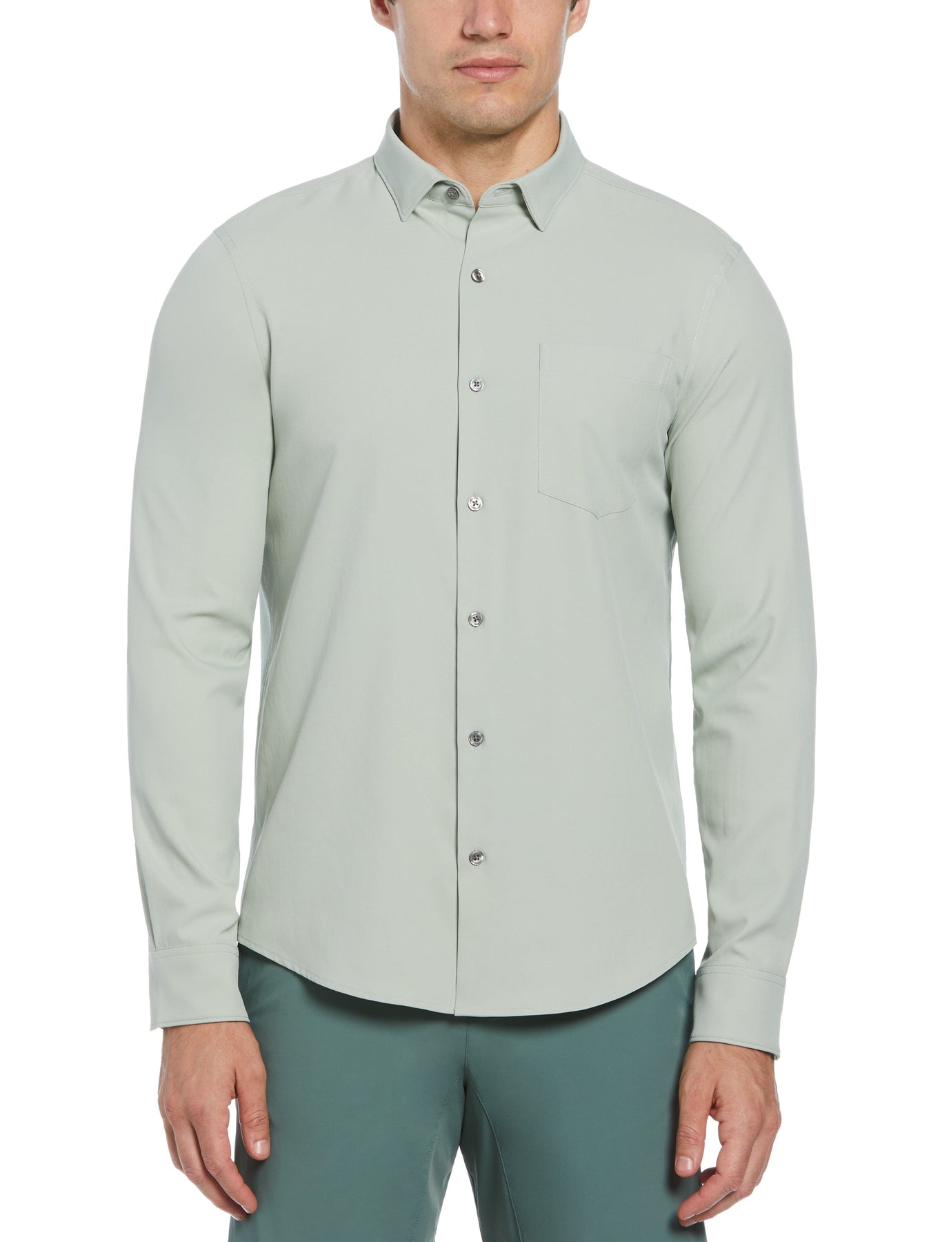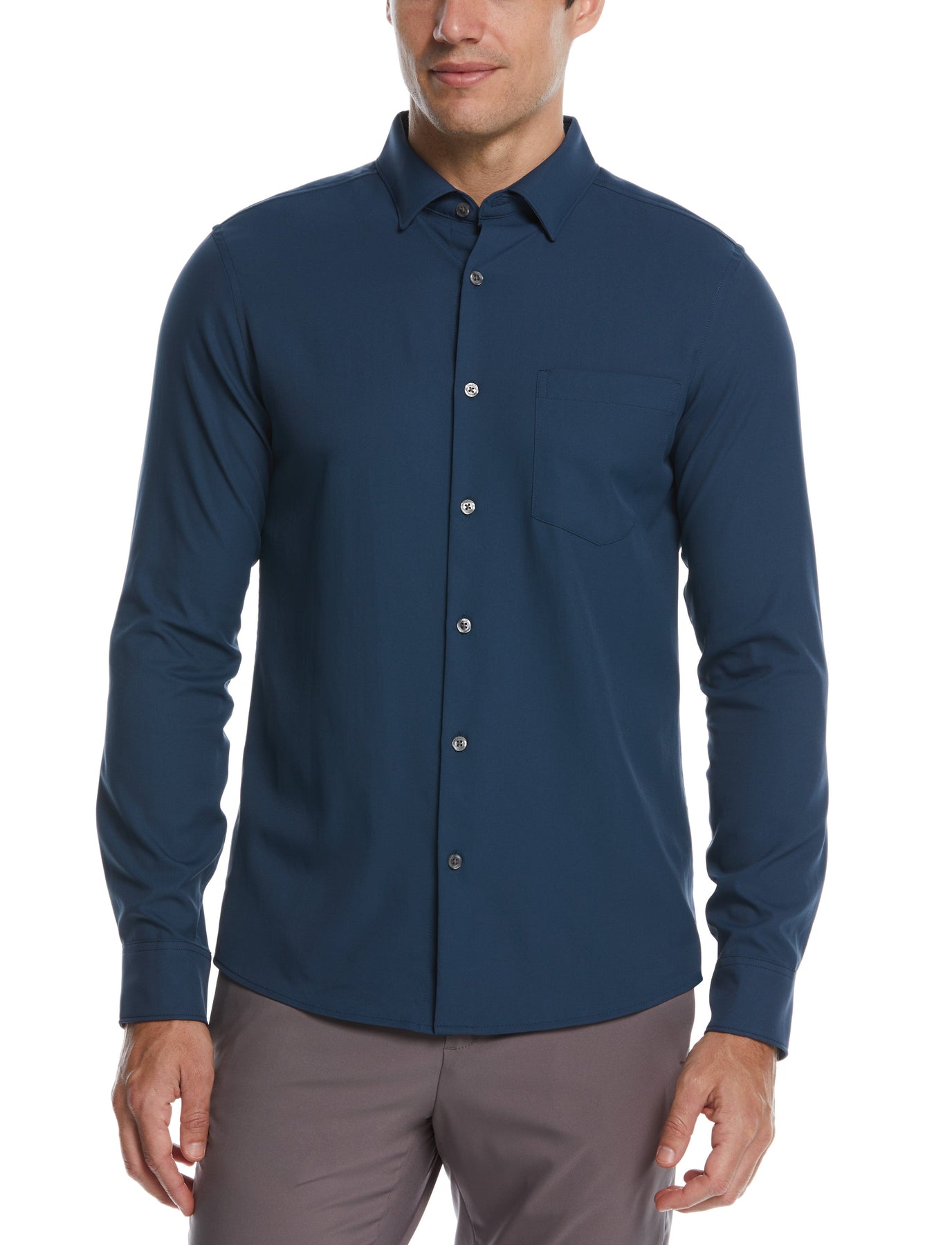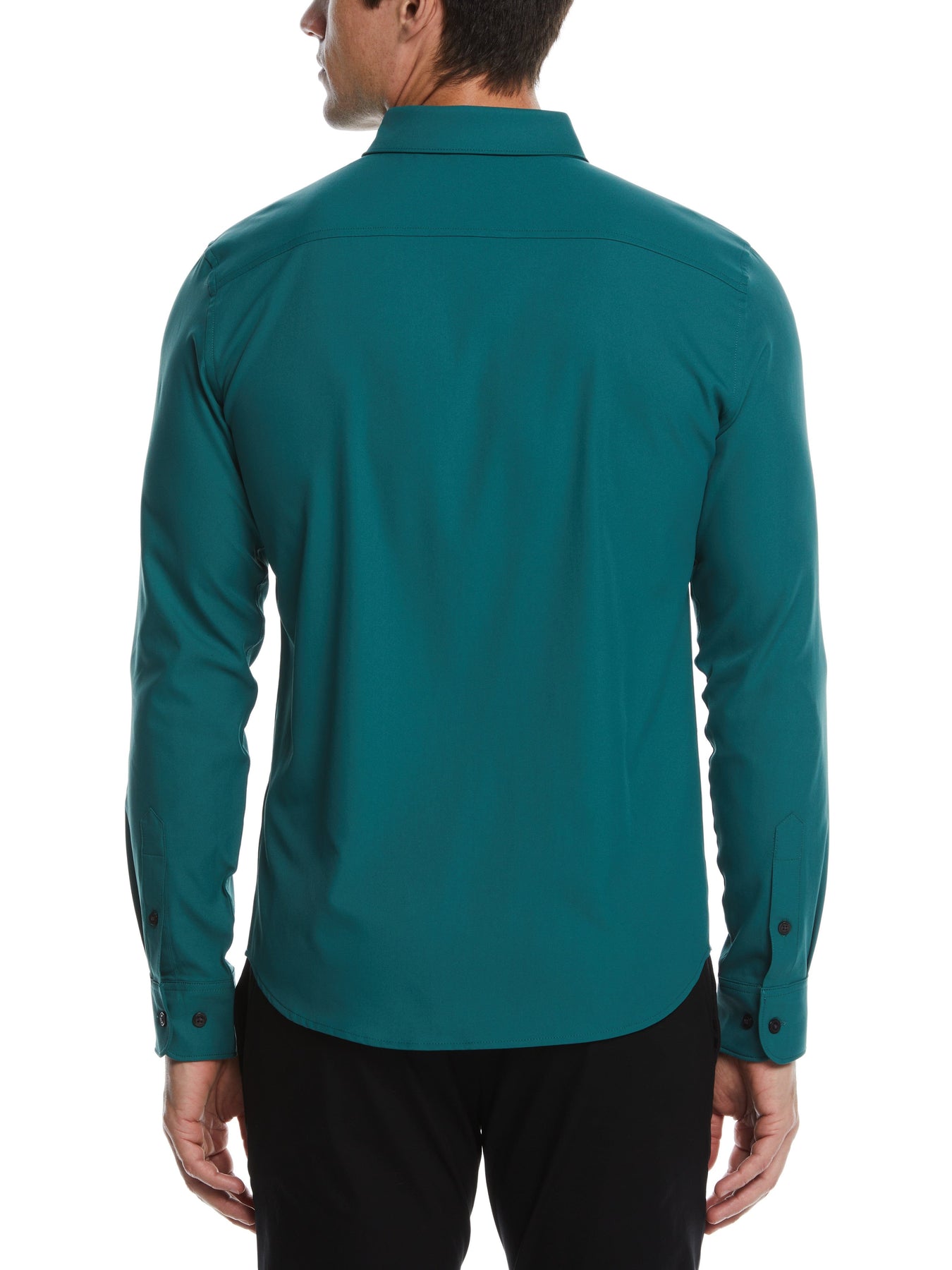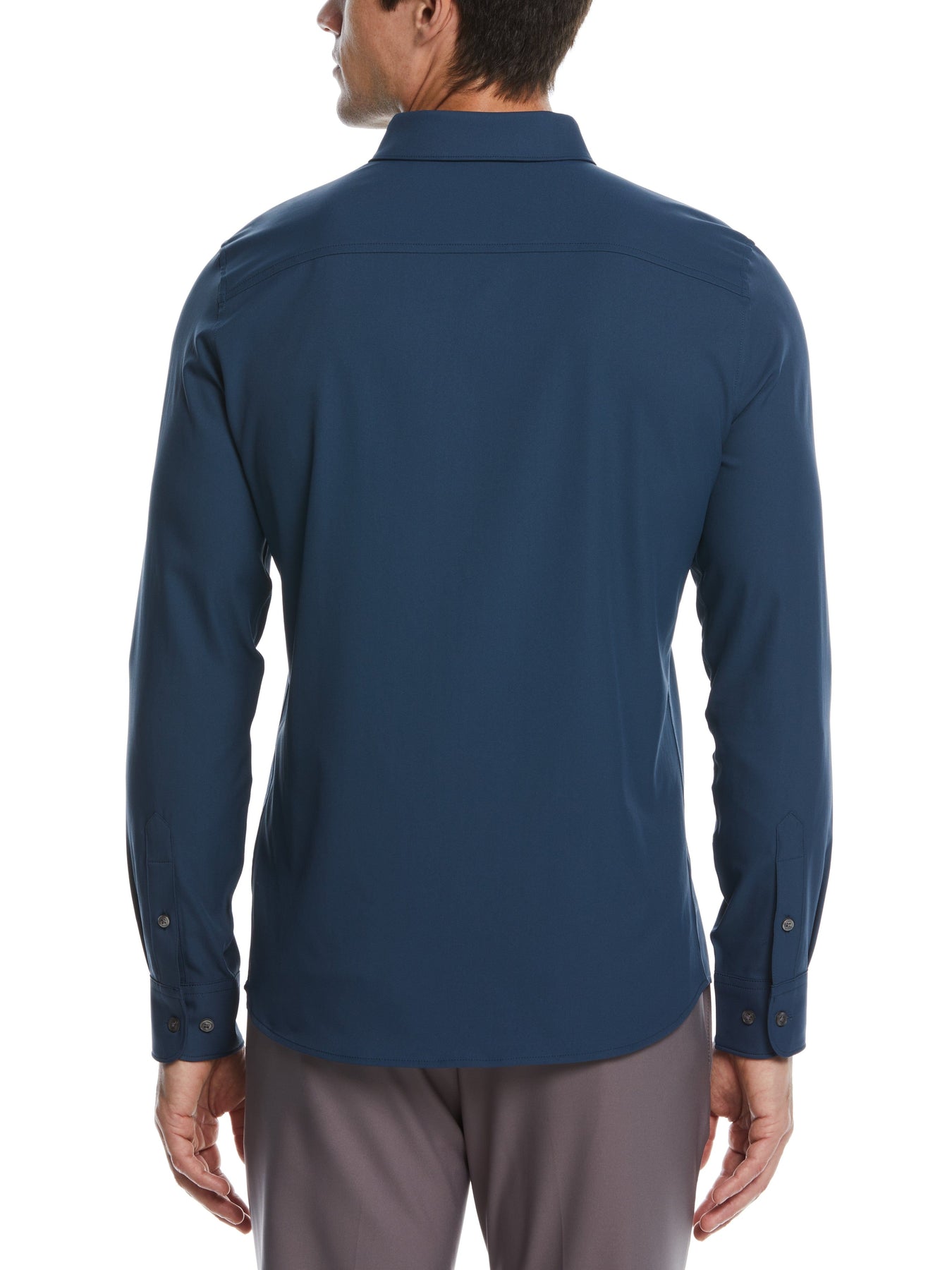 Form and function come together in this smart men’s black sport shirt from Perry Ellis. Designed to be worn untucked, the men’s long sleeve shirt is crafted from light and breathable twill fabric. Total Stretch lets you move comfortably in any direction, while moisture wicking helps keep you cool and dry.