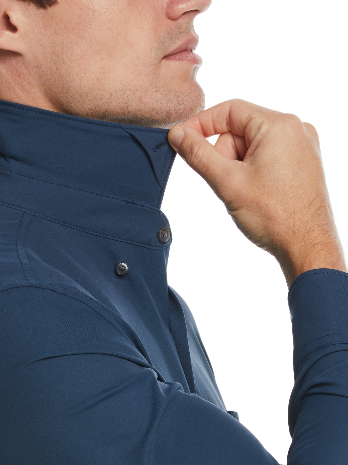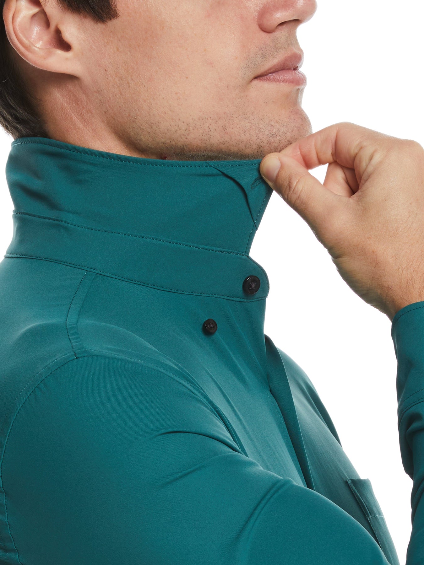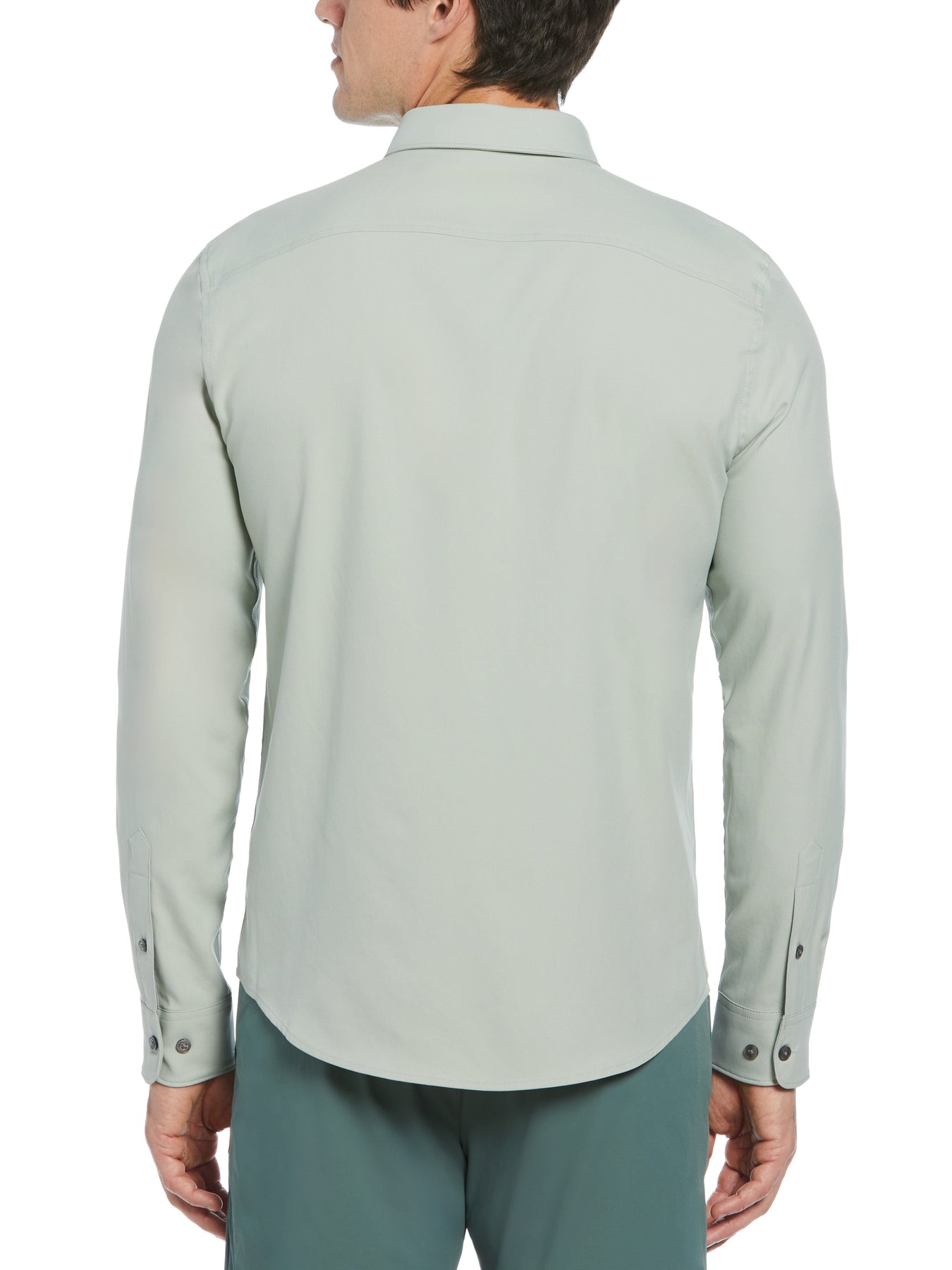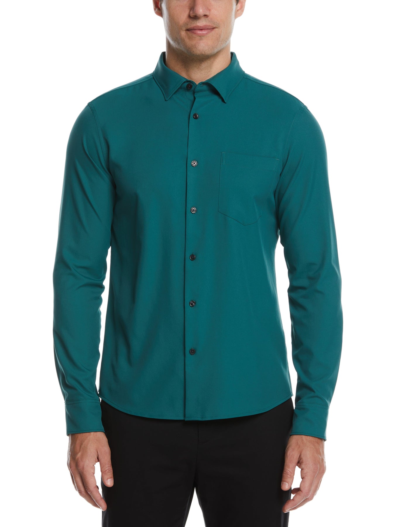 Form and function come together in this smart men’s black sport shirt from Perry Ellis. Designed to be worn untucked, the men’s long sleeve shirt is crafted from light and breathable twill fabric. Total Stretch lets you move comfortably in any direction, while moisture wicking helps keep you cool and dry.