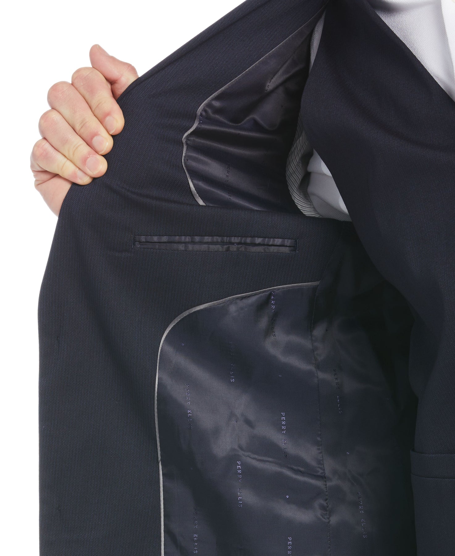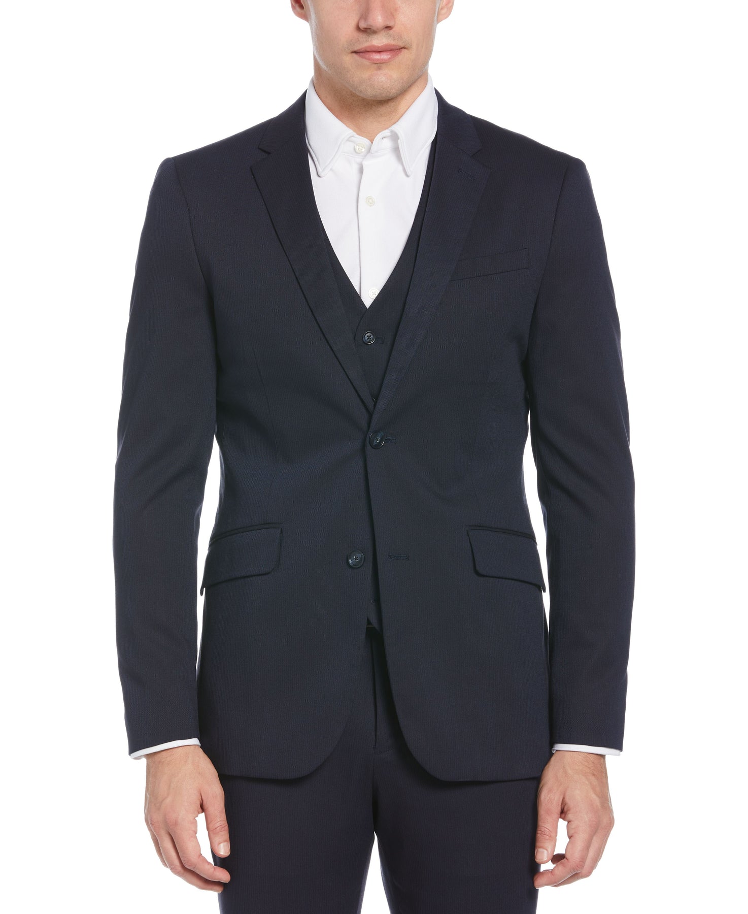 This Perry Ellis tech suit jacket is the perfect addition to your wardrobe. Subtle, thin vertical stripes cascade up and down your suit jacket. Performance stretch moves you to provide all-day comfort and water-resistant fabric keeps you and your suit looking great. Very slim fit is for the guys who want skinny without constriction. It provides a sleek appeal by remaining trimmer through the shoulder, chest and sleeves.