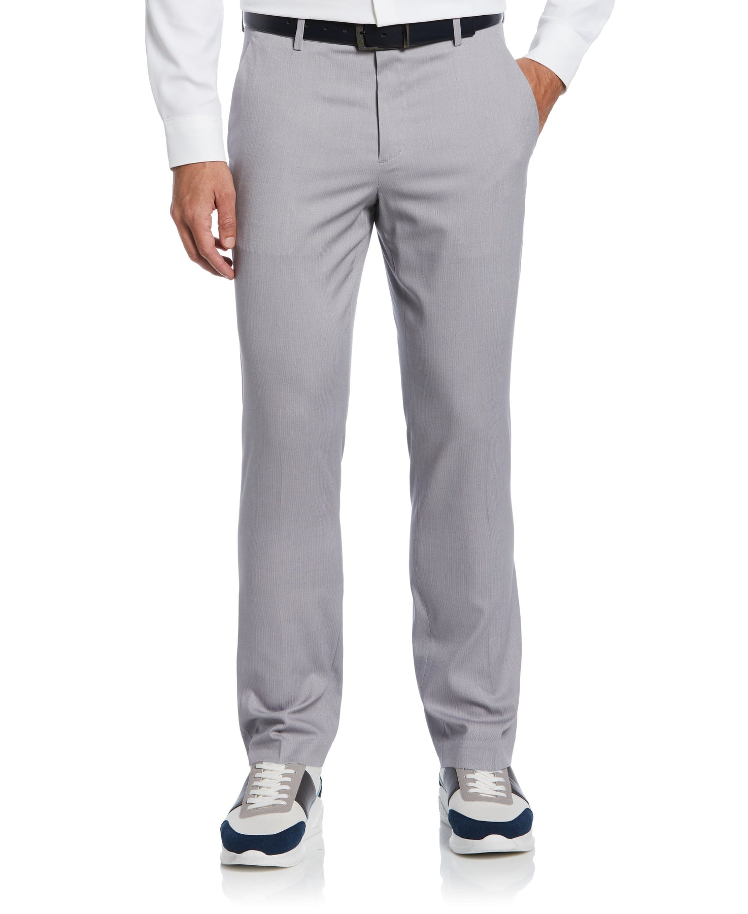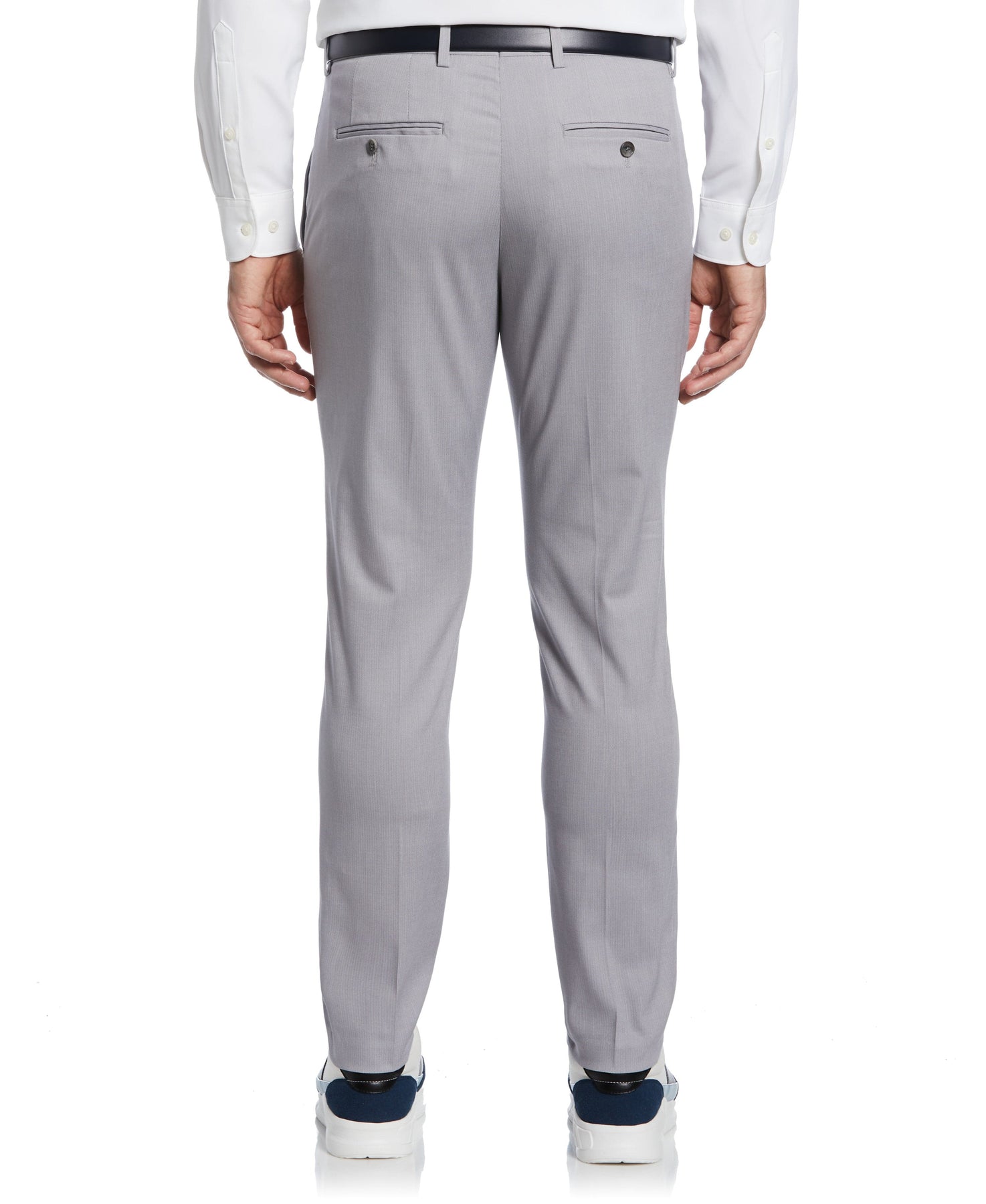 These Perry Ellis tech suit pants are the perfect addition to your wardrobe. Subtle, thin vertical stripes cascade up and down your suit pant. Performance stretch moves you to provide all-day comfort and water-resistant fabric keeps you and your suit looking great. Very slim fit is for the guys who want skinny without constriction, providing a sleek pant that's trimmer through the waist, hips and thighs.